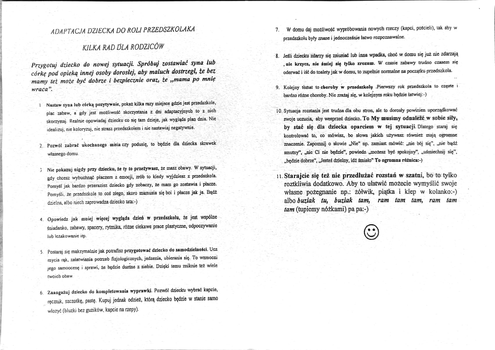 Z przyjemnością informujemy, że nadchodzi czas dni adaptacyjnych dla Państwa dzieci. Dni te mają na celu przyzwyczajenie nowych przedszkolaków do środowiska przedszkolnego, co pozwoli im poczuć się bezpiecznie i komfortowo podczas regularnych zajęć. Dzieci wraz z rodzicami przychodzą na daną godzinę (po wcześniejszym wpisaniu się na listę).