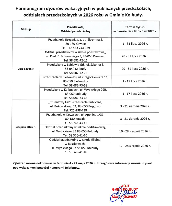 uprzejmie informujemy, że dyżur wakacyjny 2026r. w naszym przedszkolu