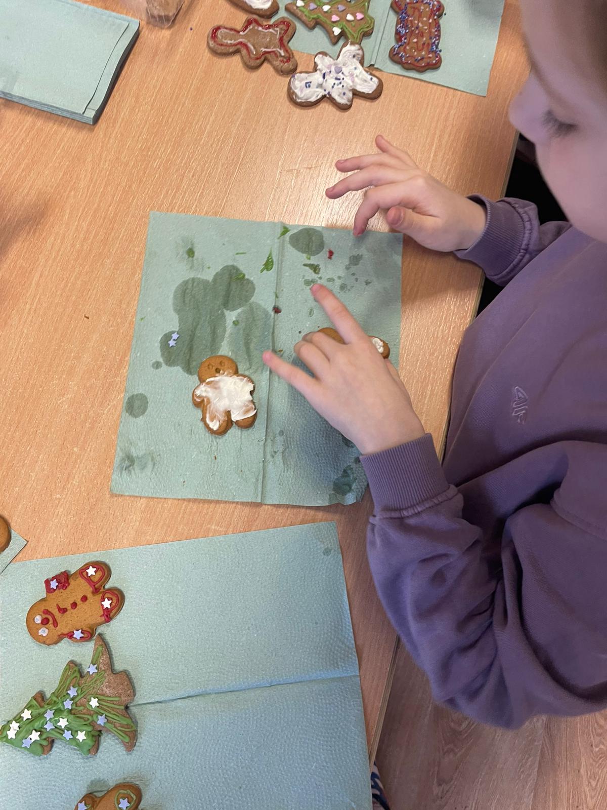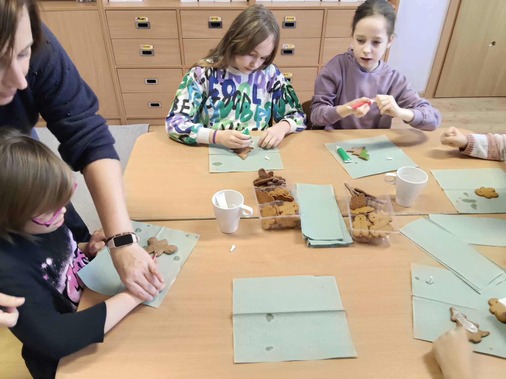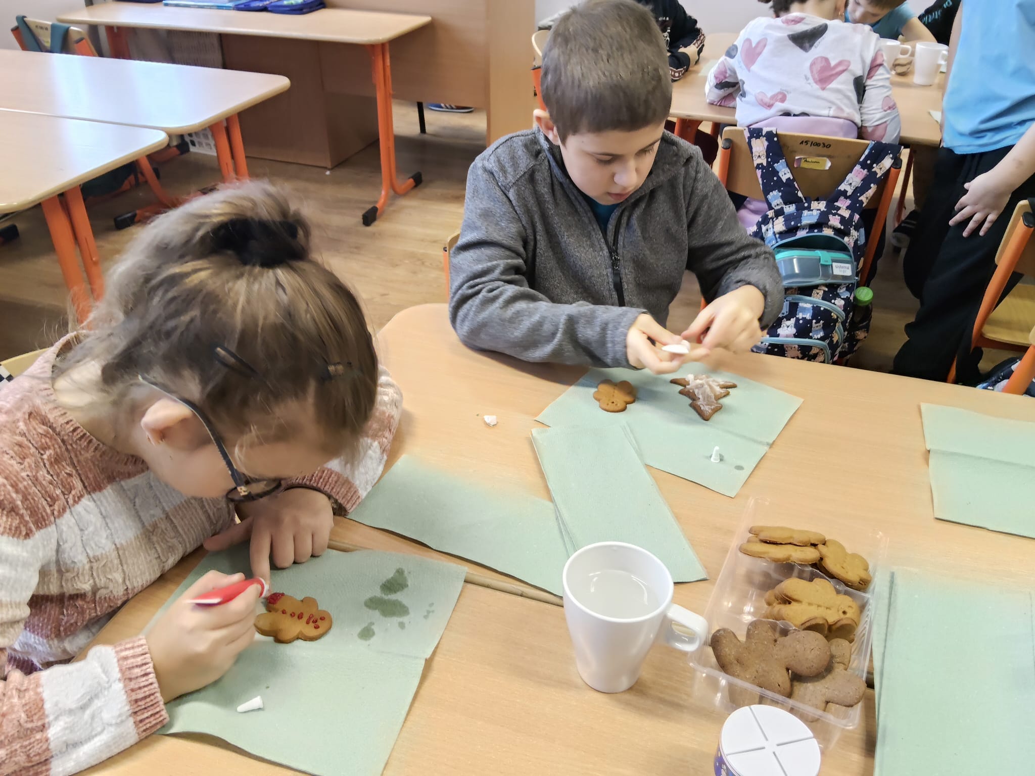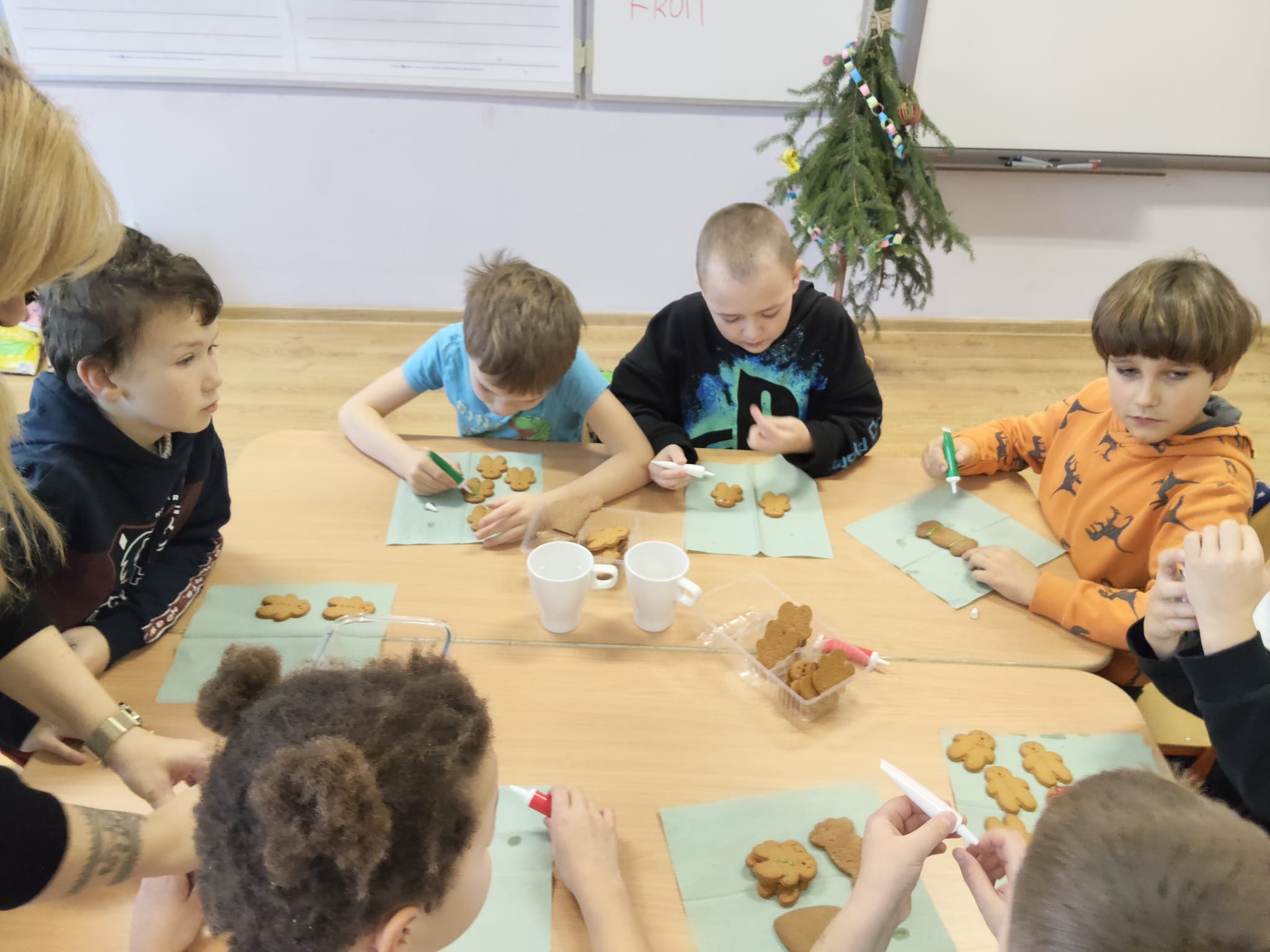 W naszej szkole unosił się dziś wyjątkowy, świąteczny aromat - wszystko za sprawą dekorowania pierników, w których z ogromnym entuzjazmem uczestniczyły dzieci z grupy Zajączków oraz uczniowie klasy 1,2 i 3. Przy stołach pełnych kolorowych lukrów, posypek i pachnących wypieków, powstawały prawdziwe małe dzieła sztuki. Każdy piernik był inny: jedne zdobione delikatnymi wzorami, inne pełne barw i fantazji, a wszystkie wykonane z wielkim zaangażowaniem i radością.