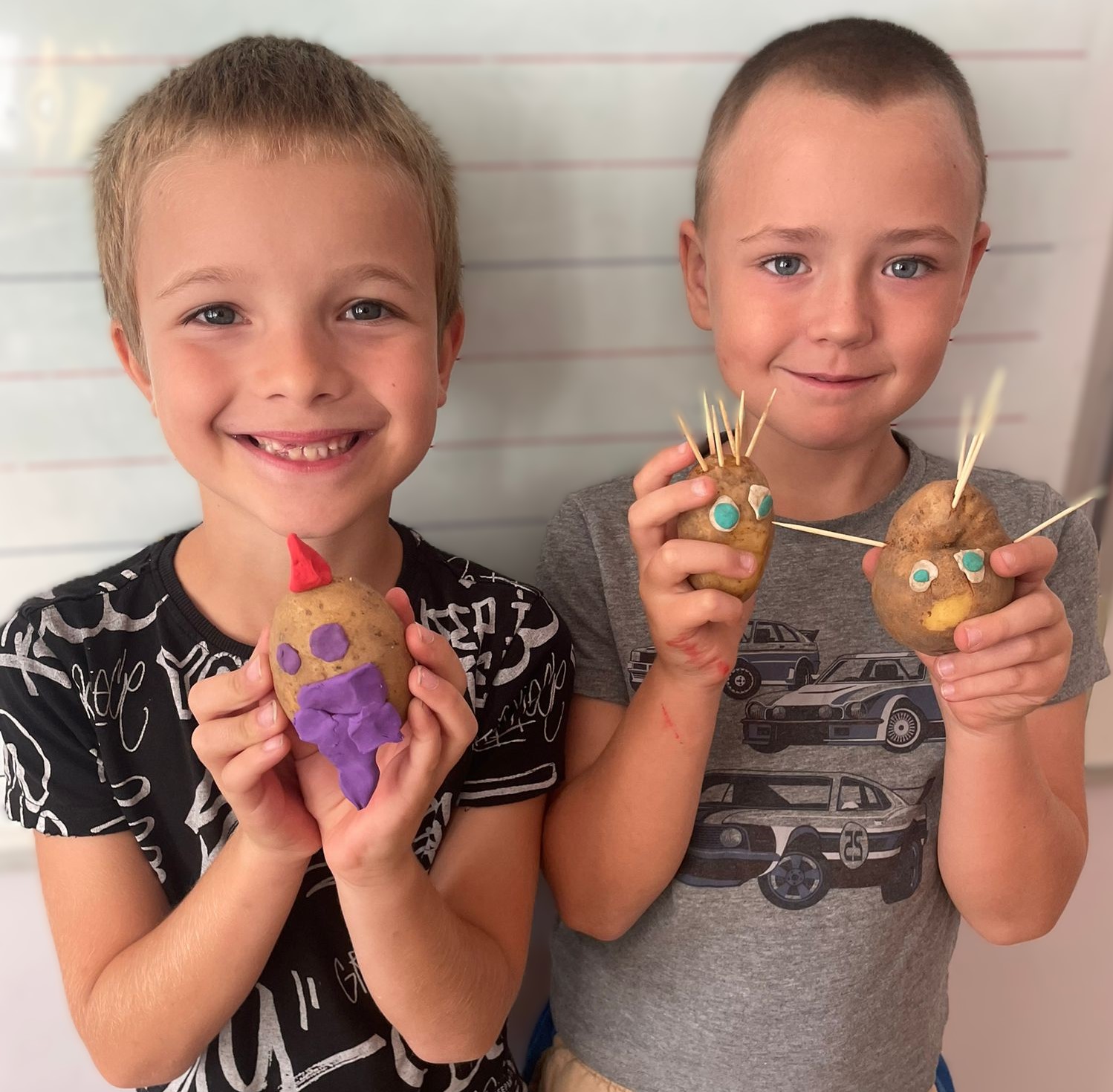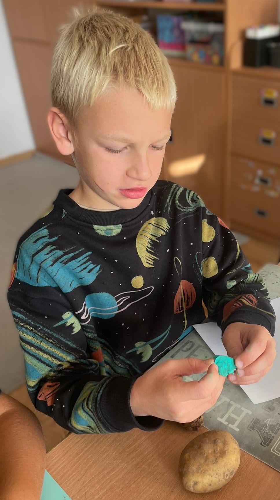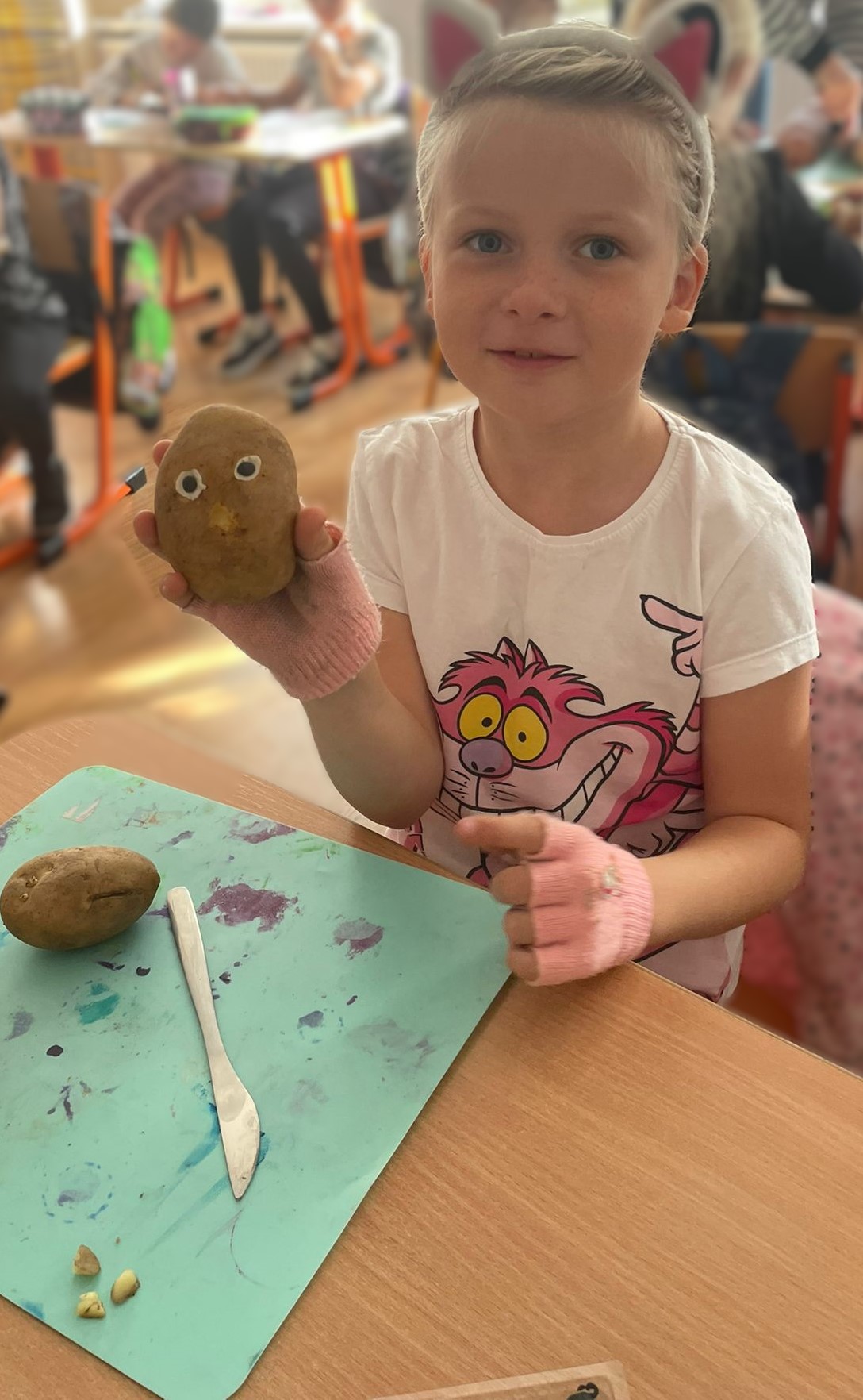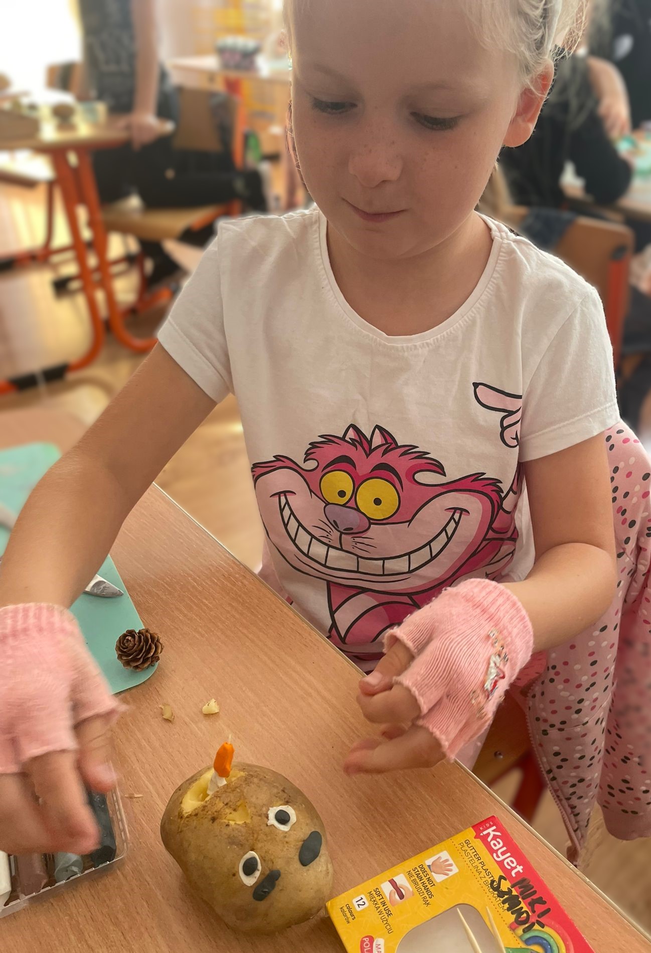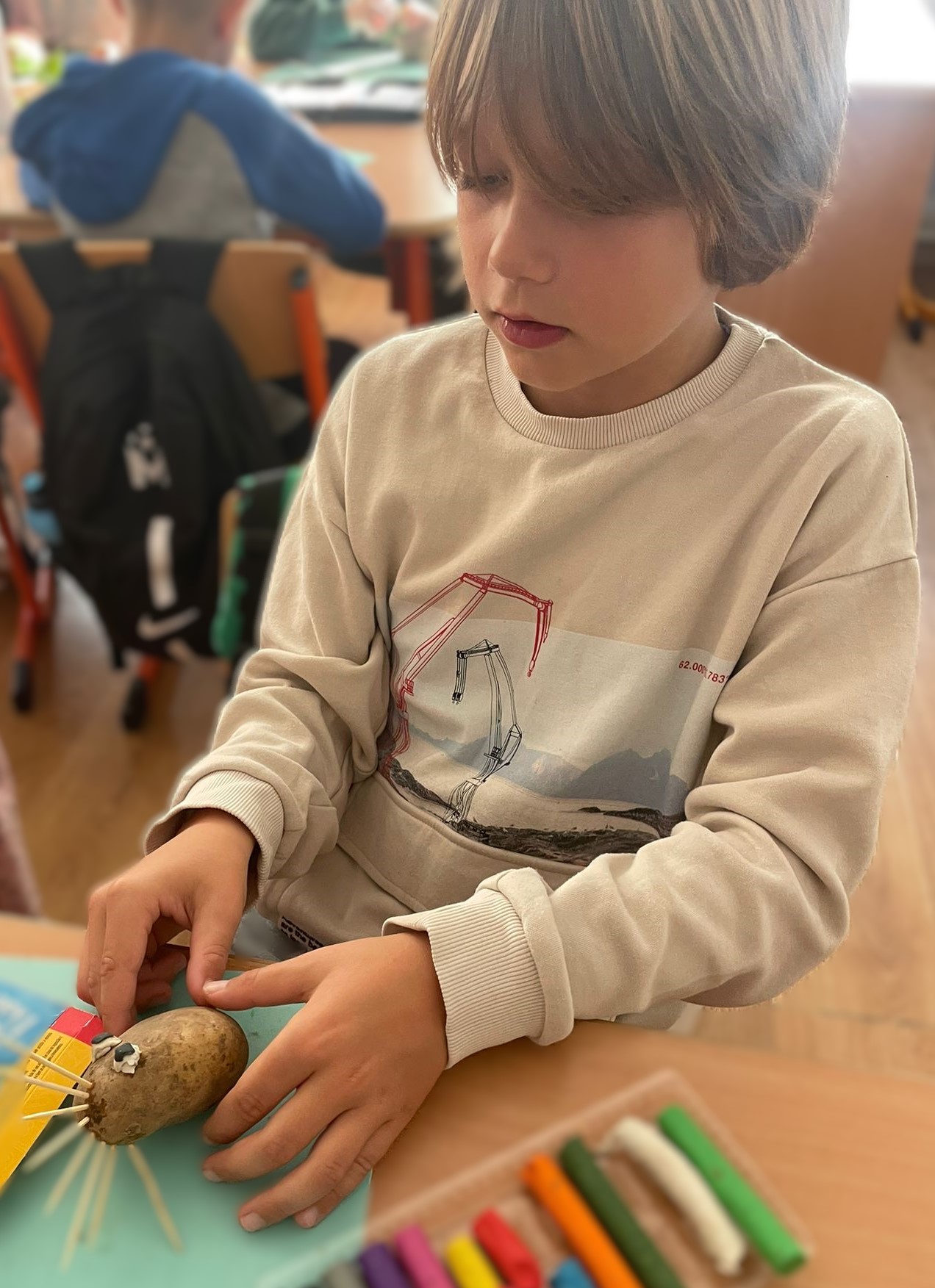 Na zajęciach widać uczniów, którzy z ogromnym zaangażowaniem i uśmiechem tworzą niezwykłe figurki z ziemniaków. Dzięki kolorowym dodatkom, wykałaczkom, plastelinie i papierowym elementom zwykłe warzywa zamieją się w fantazyjne postacie - od zabawnych ludków po bajkowe stworki.