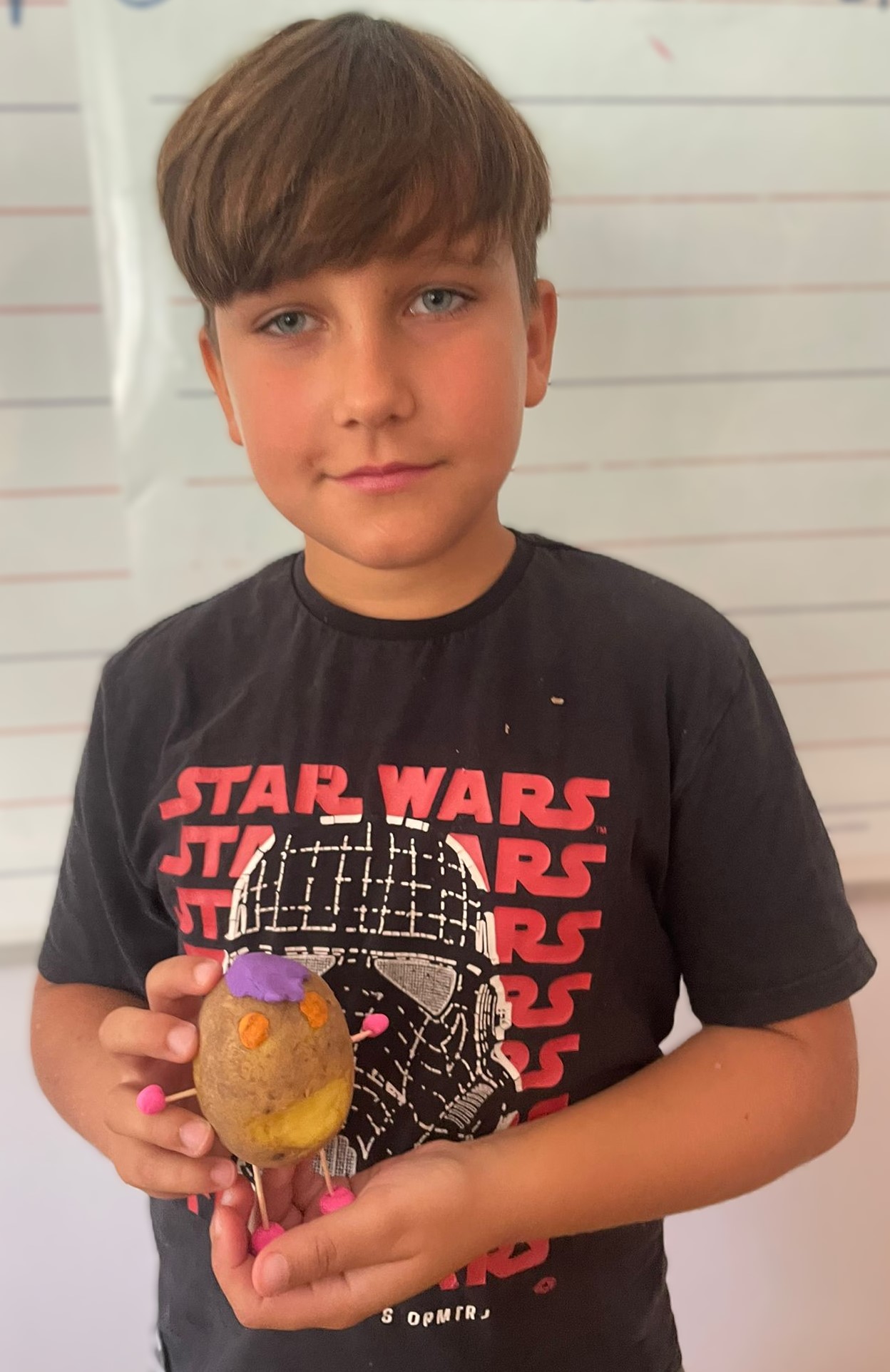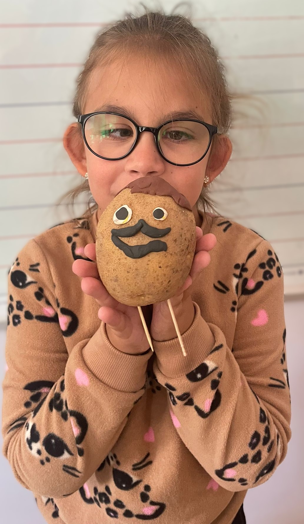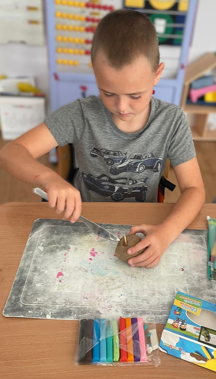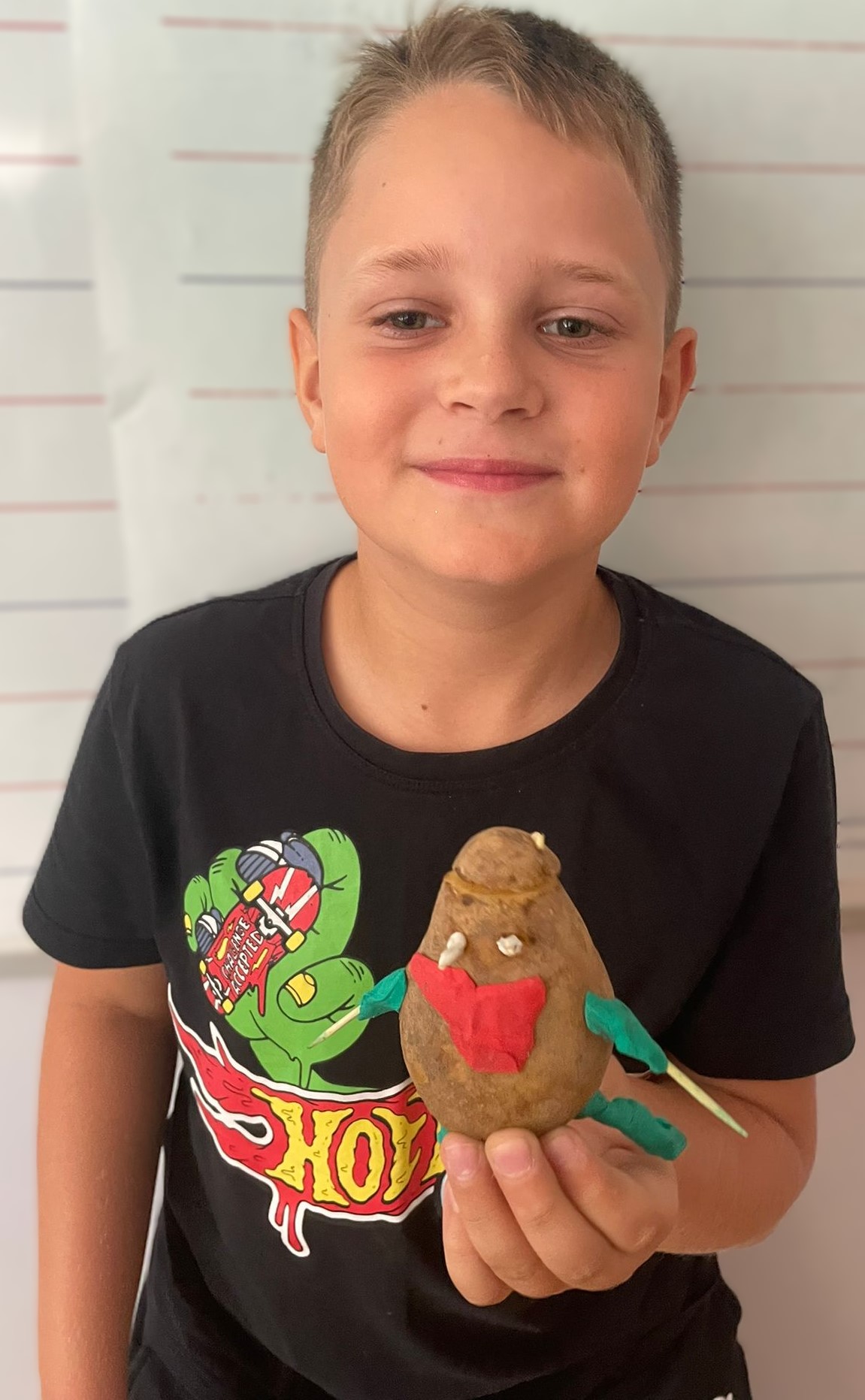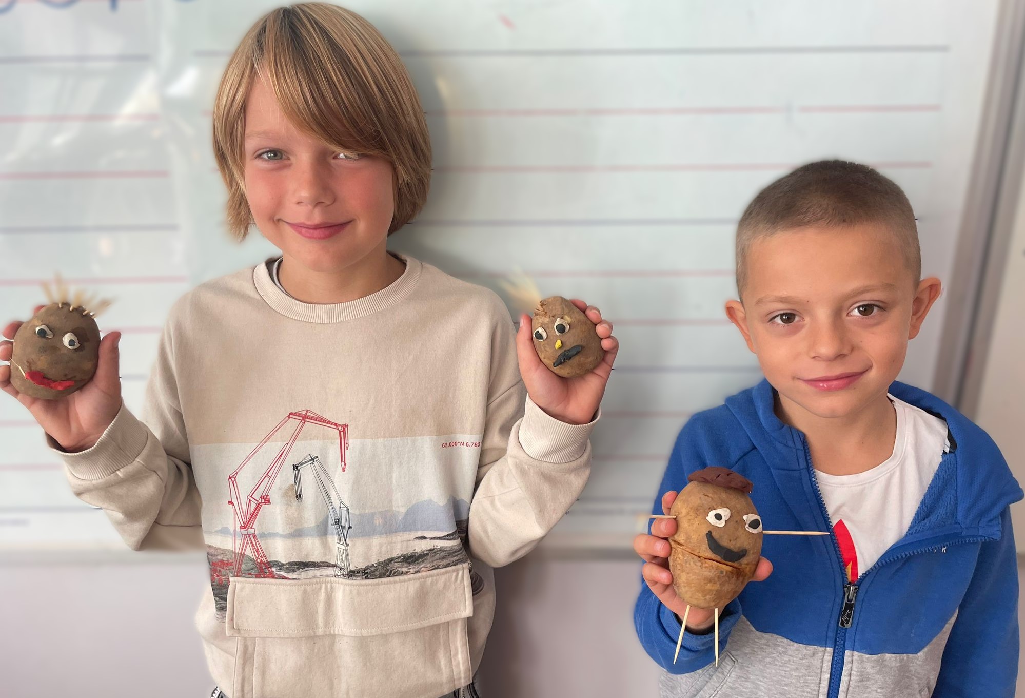 Na zajęciach widać uczniów, którzy z ogromnym zaangażowaniem i uśmiechem tworzą niezwykłe figurki z ziemniaków. Dzięki kolorowym dodatkom, wykałaczkom, plastelinie i papierowym elementom zwykłe warzywa zamieją się w fantazyjne postacie - od zabawnych ludków po bajkowe stworki.