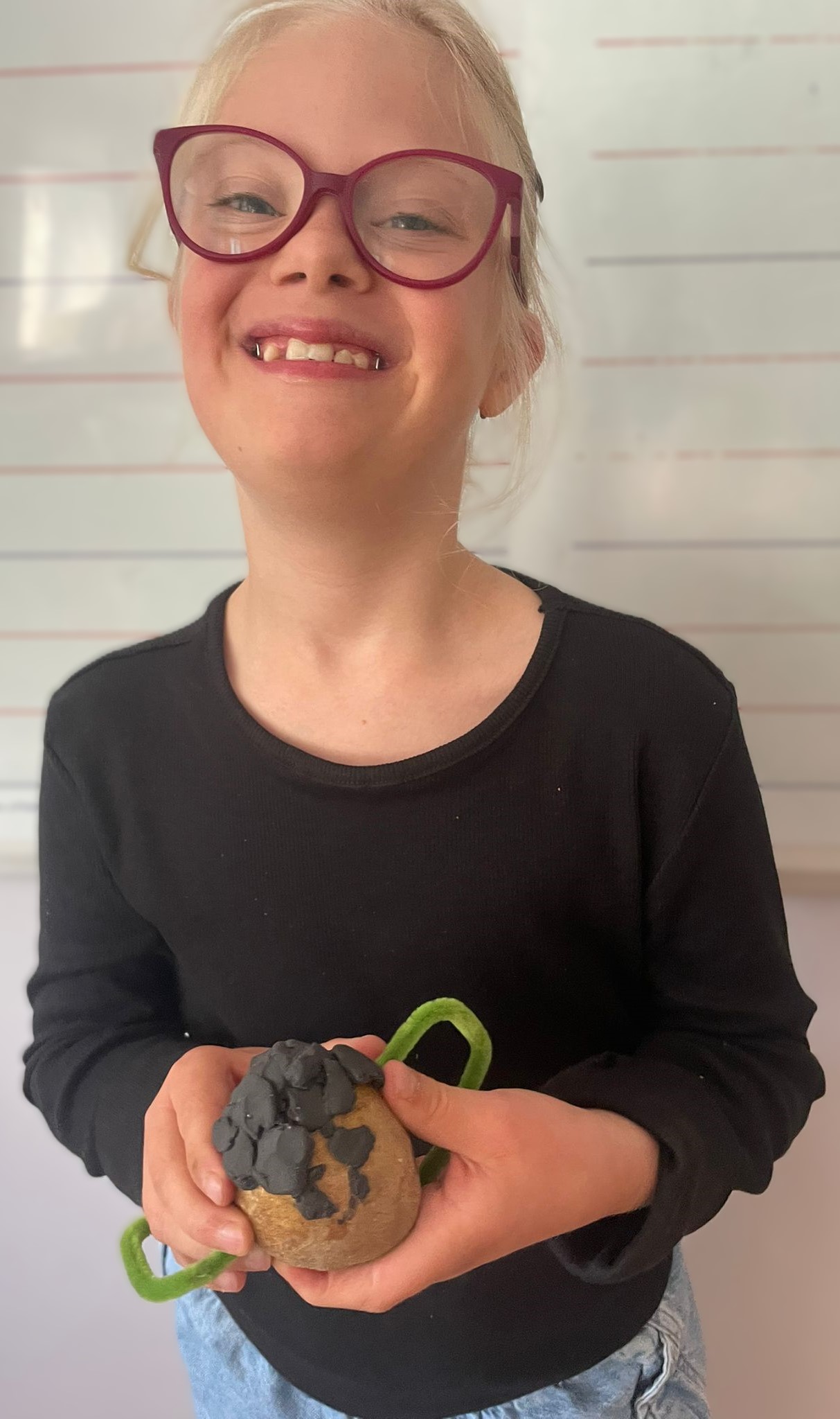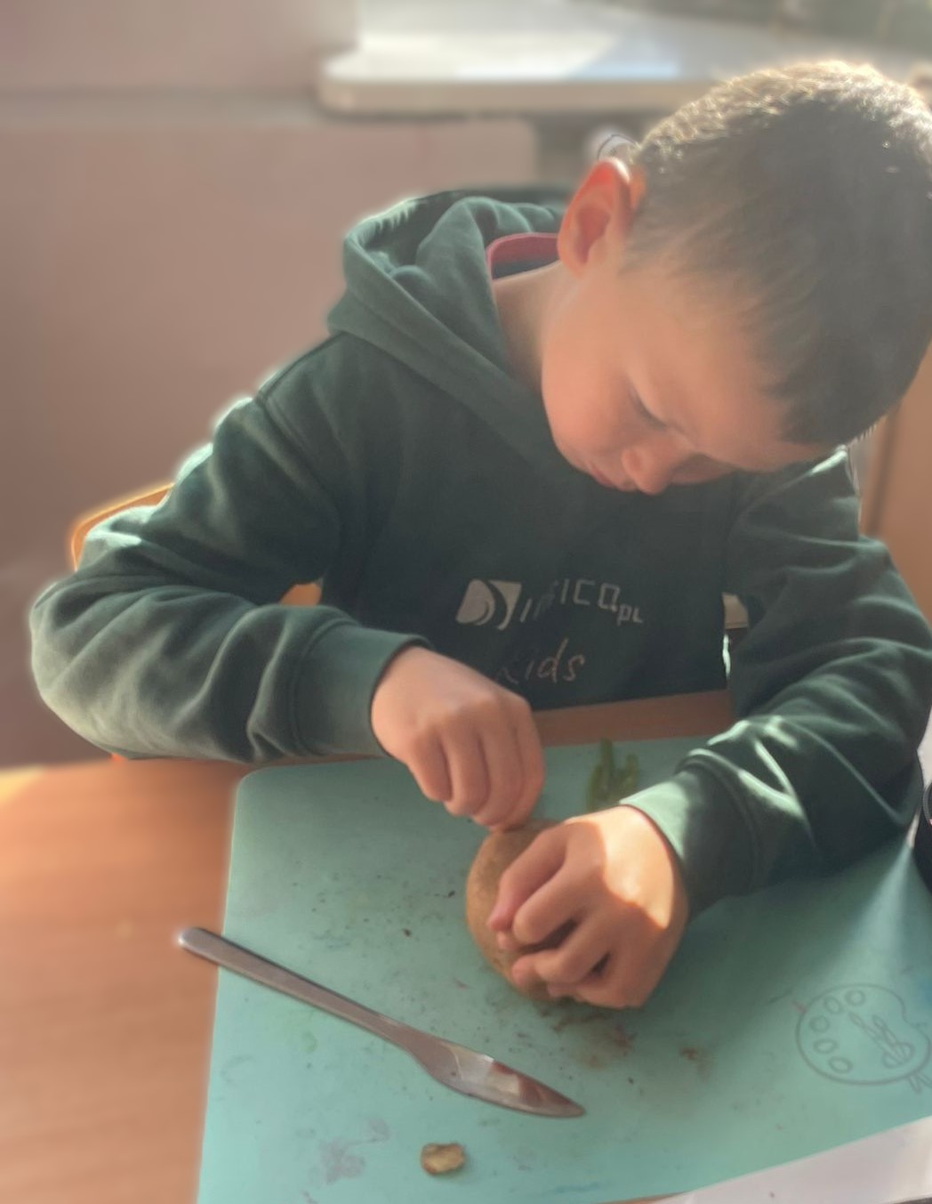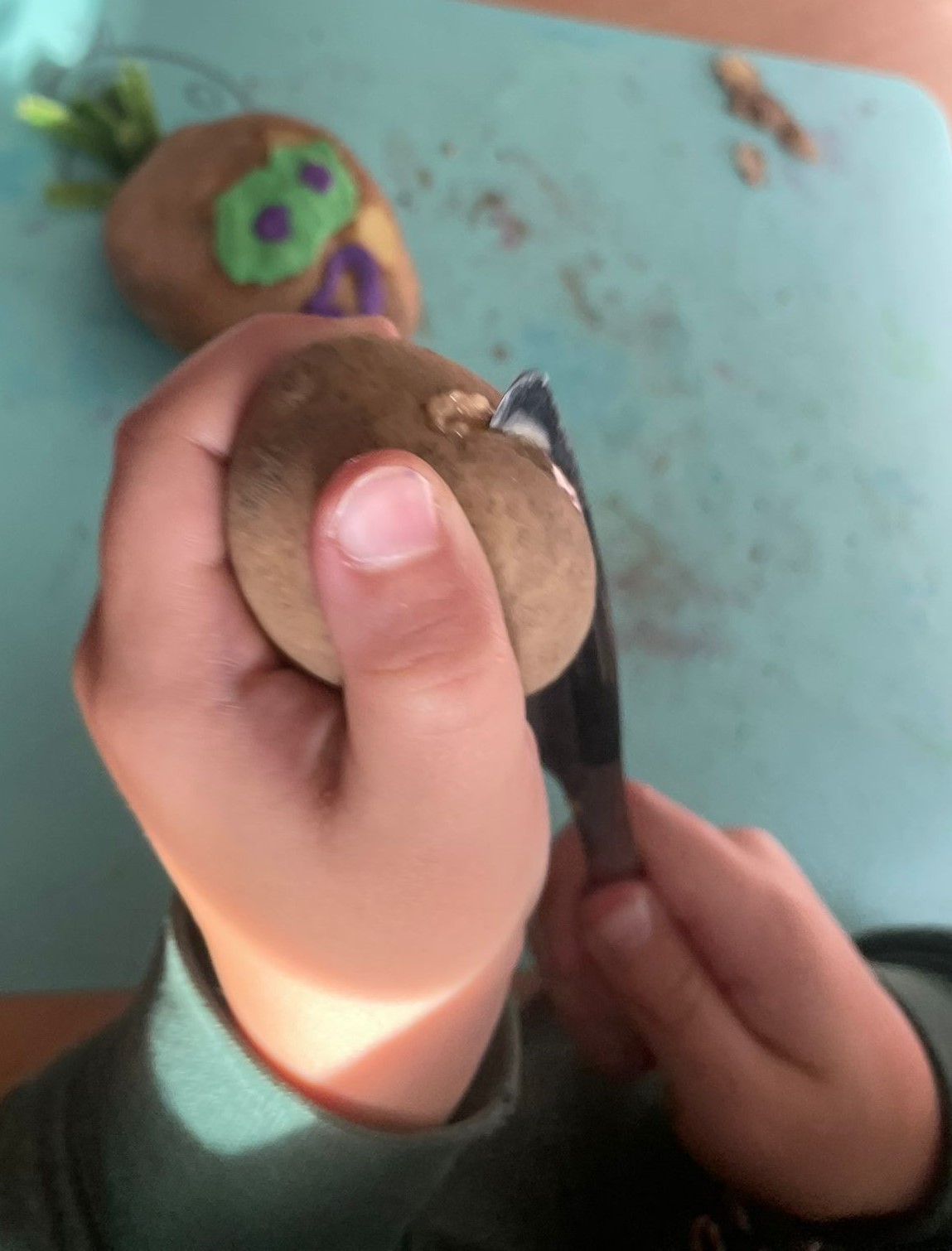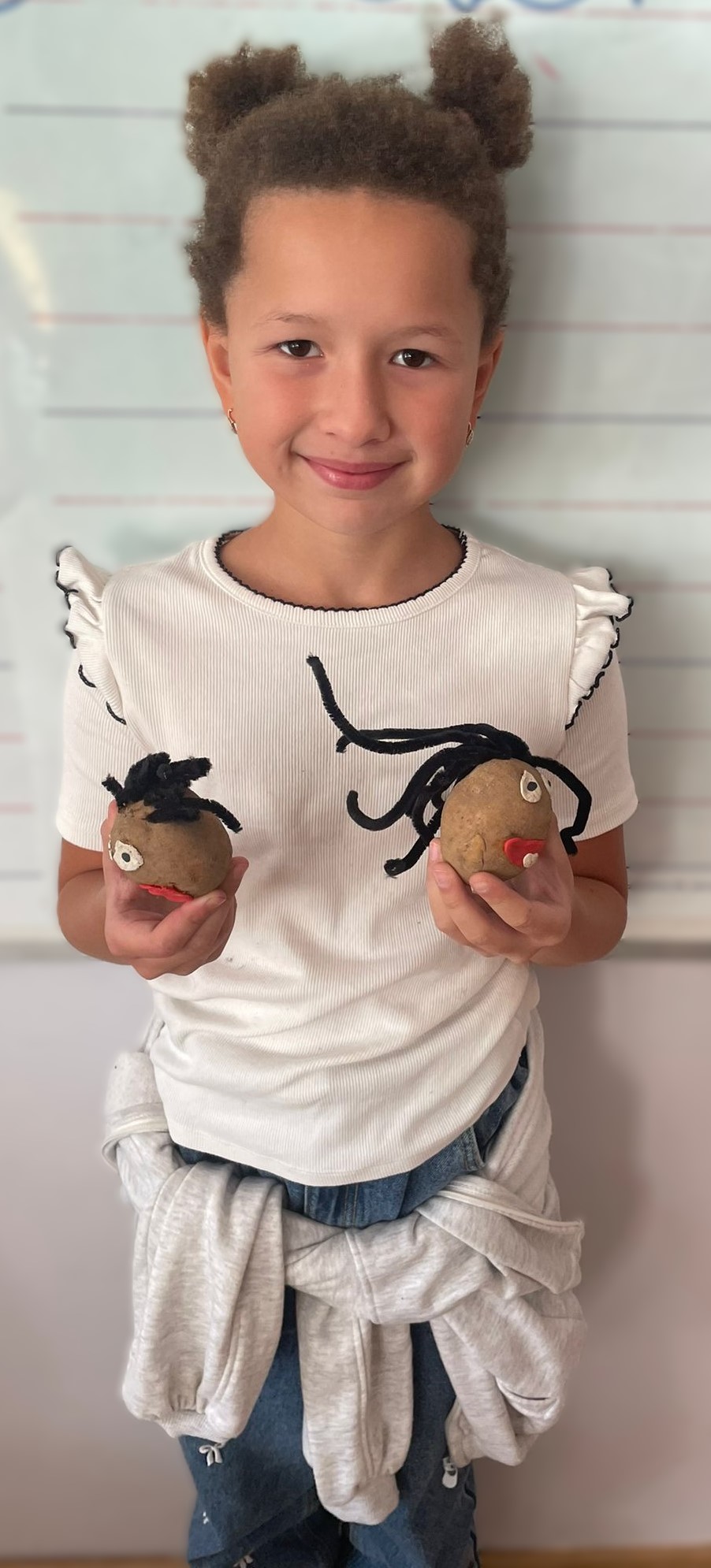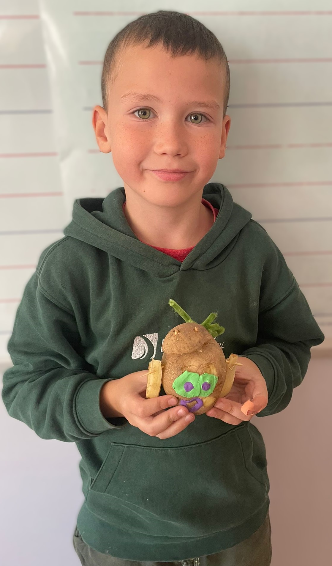Na zajęciach widać uczniów, którzy z ogromnym zaangażowaniem i uśmiechem tworzą niezwykłe figurki z ziemniaków. Dzięki kolorowym dodatkom, wykałaczkom, plastelinie i papierowym elementom zwykłe warzywa zamieją się w fantazyjne postacie - od zabawnych ludków po bajkowe stworki.