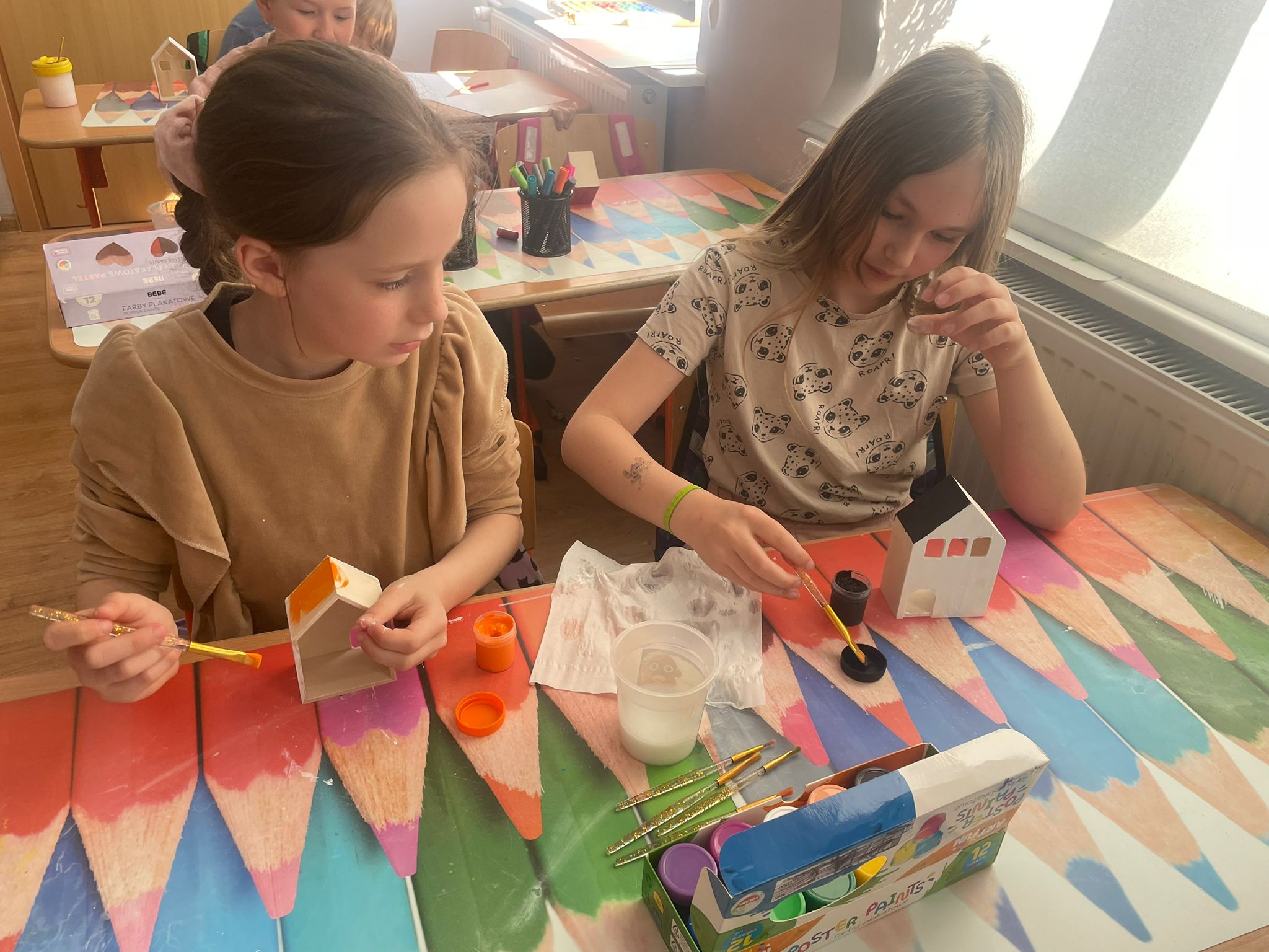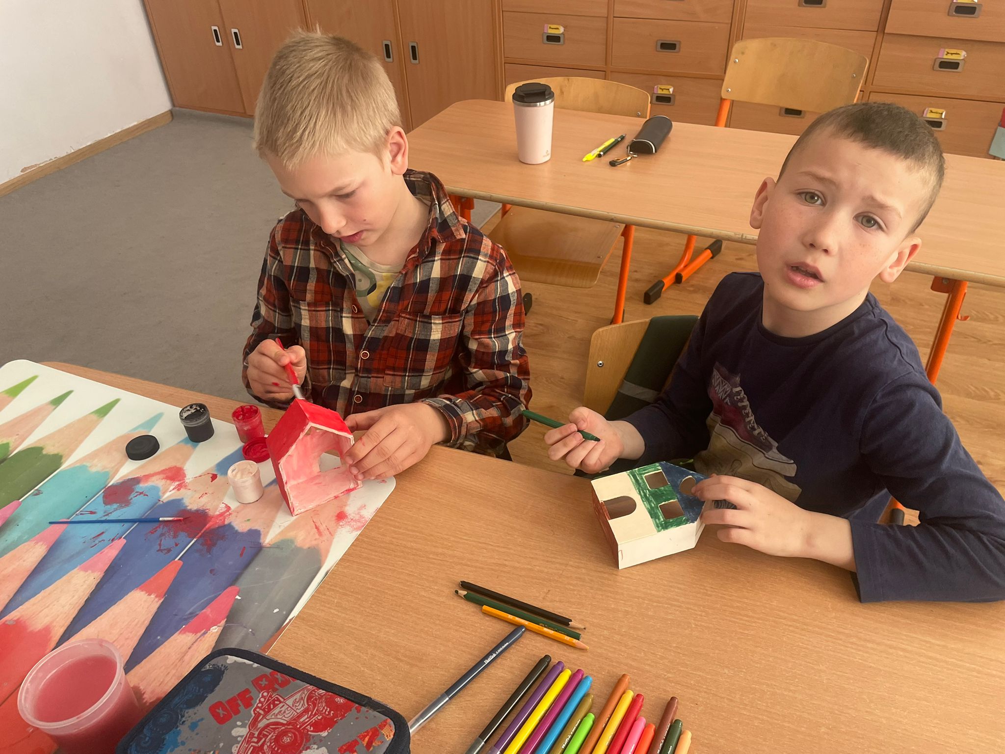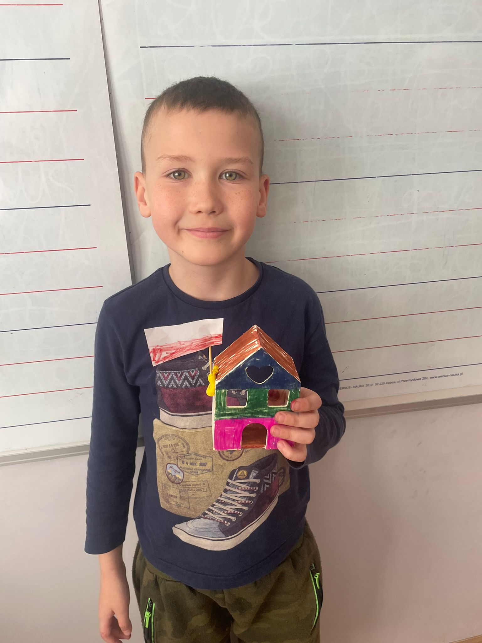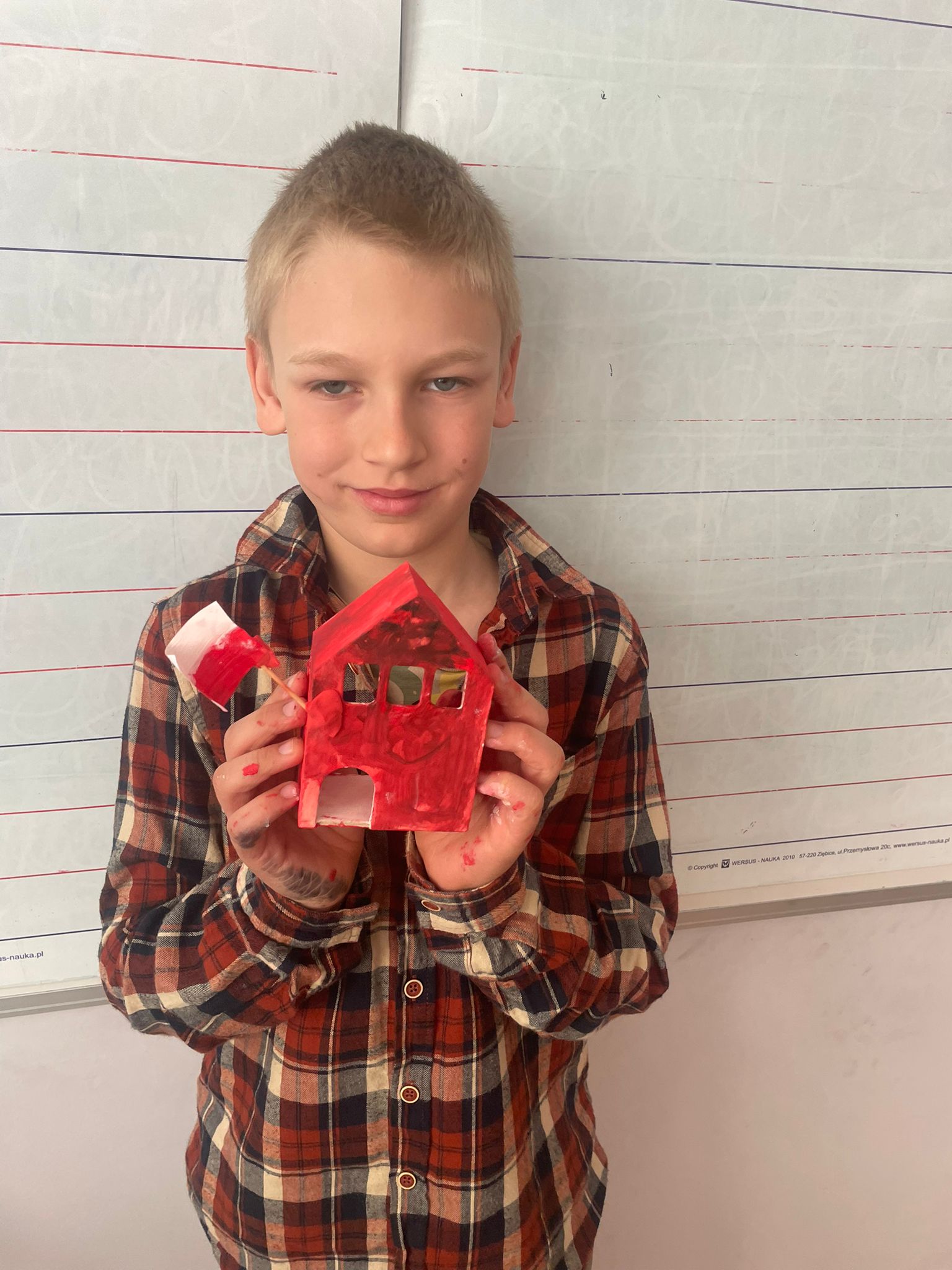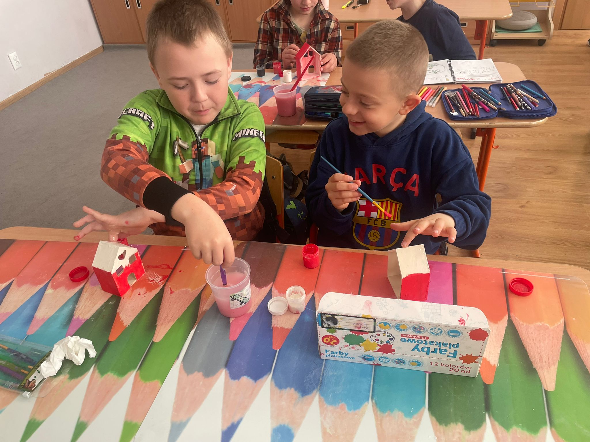 Uczniowie klas 2 i 3 na zajęciach wykonywali pracę plastyczną polegającą na malowaniu gotowych drewnianych domków. Każde dziecko samodzielnie dobierało kolory i sposób wykończenia, dzięki czemu powstały wyjątkowe, pełne wyobraźni projekty. Na zdjęciach widać proces twórczy - od wyboru barw, przez staranne malowanie detali, aż po prezentację gotowych prac. Kolorowe domki pokazują kreatywność uczniów oraz ich zaangażowanie w realizację tematu "Mój dom- moja ojczyzna"