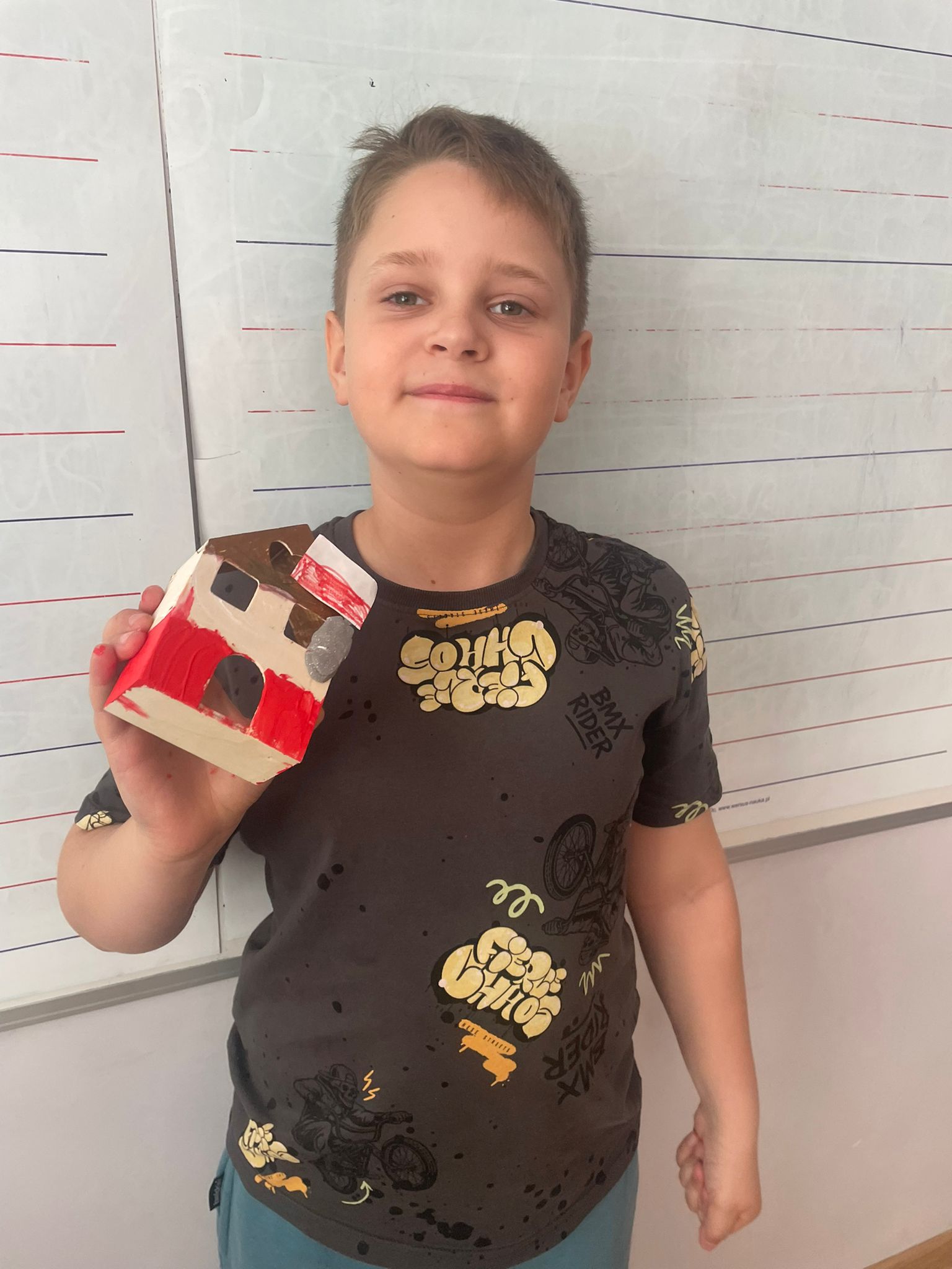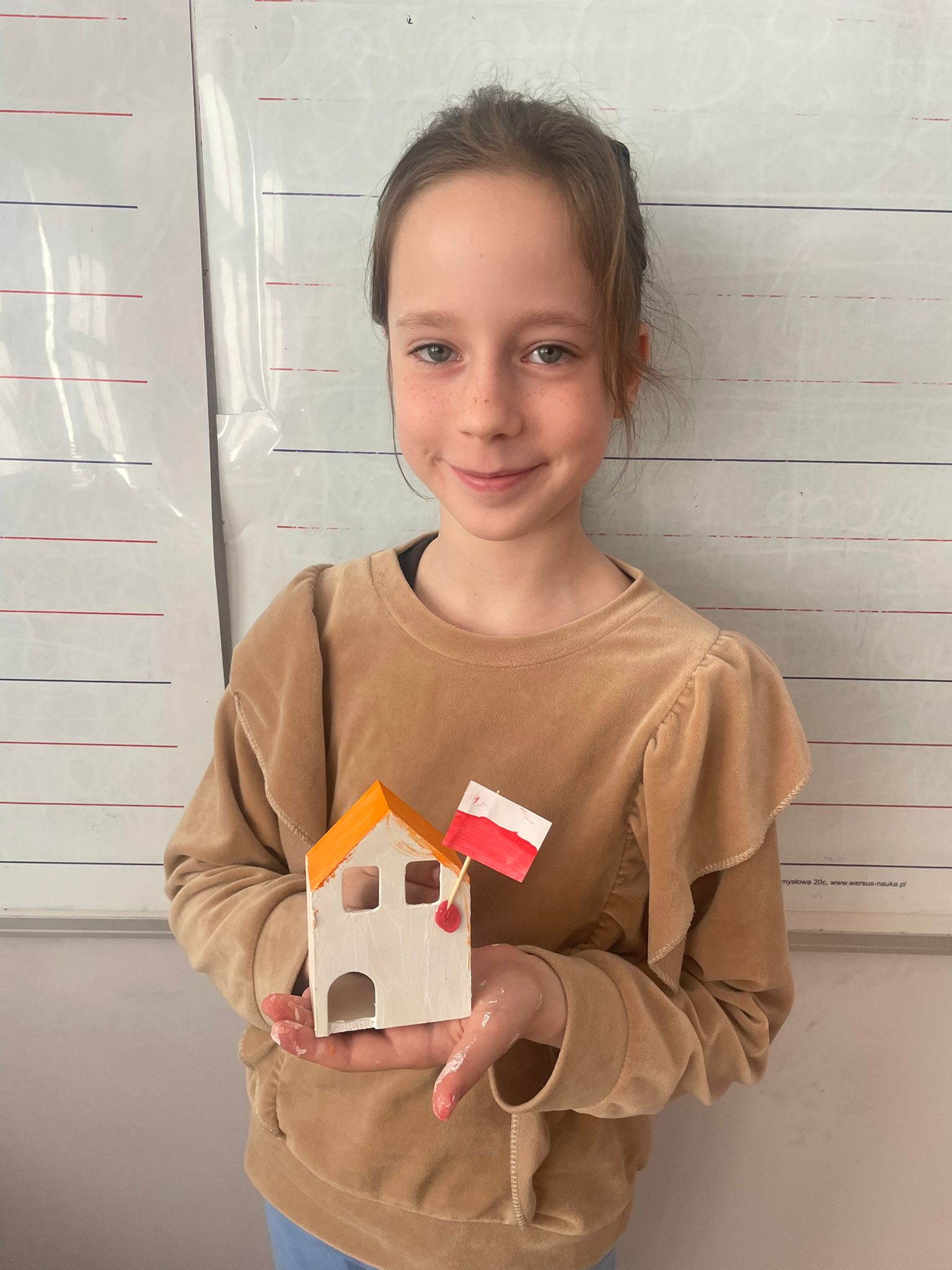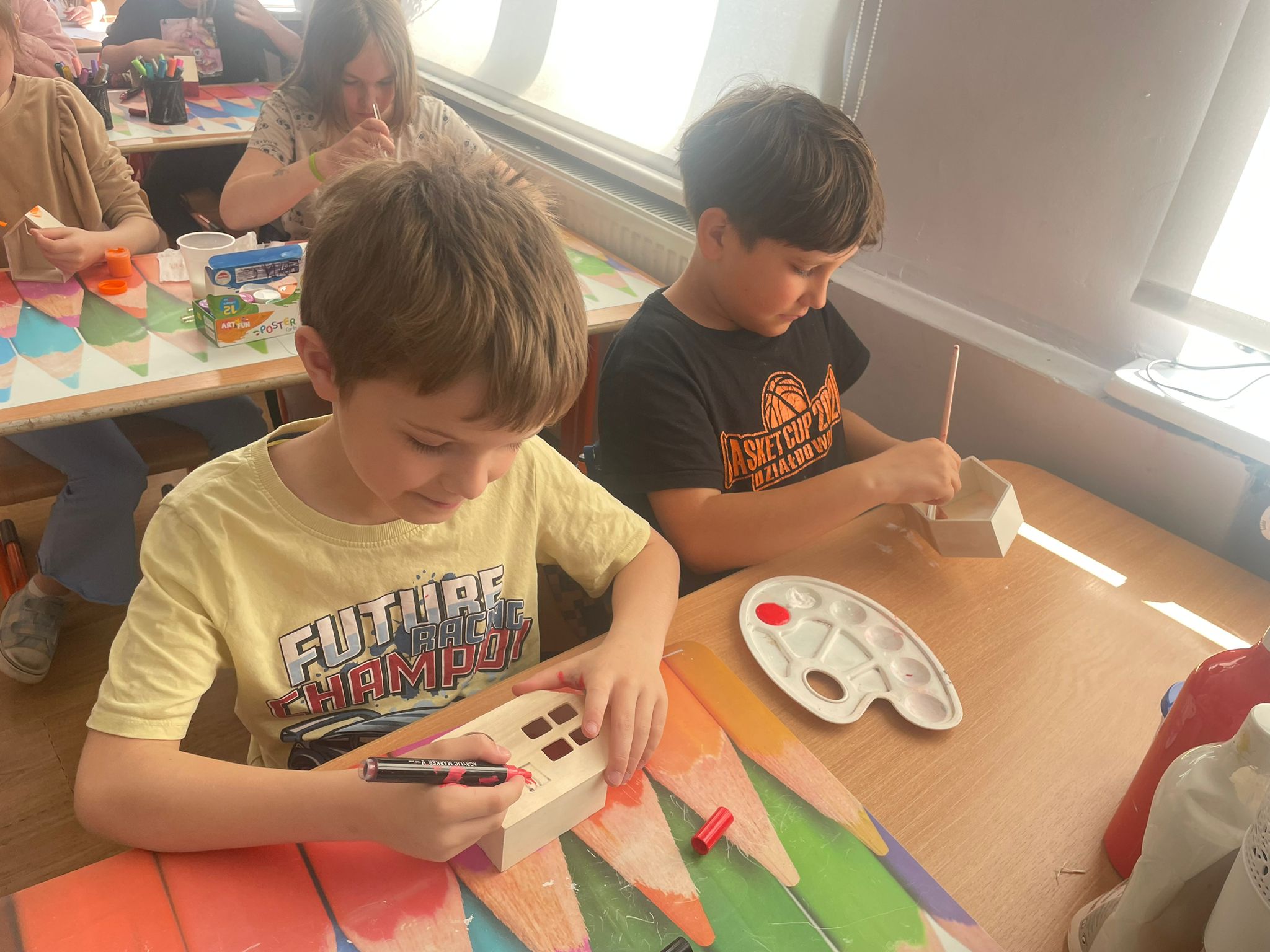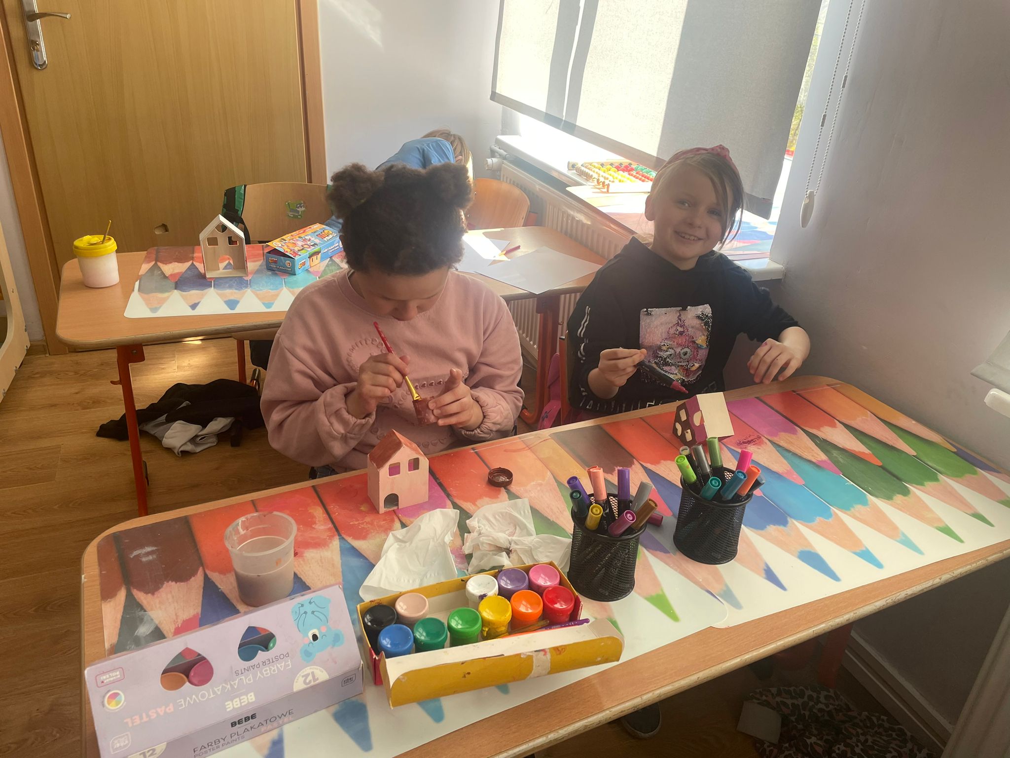 Uczniowie klas 2 i 3 na zajęciach wykonywali pracę plastyczną polegającą na malowaniu gotowych drewnianych domków. Każde dziecko samodzielnie dobierało kolory i sposób wykończenia, dzięki czemu powstały wyjątkowe, pełne wyobraźni projekty. Na zdjęciach widać proces twórczy - od wyboru barw, przez staranne malowanie detali, aż po prezentację gotowych prac. Kolorowe domki pokazują kreatywność uczniów oraz ich zaangażowanie w realizację tematu "Mój dom- moja ojczyzna"