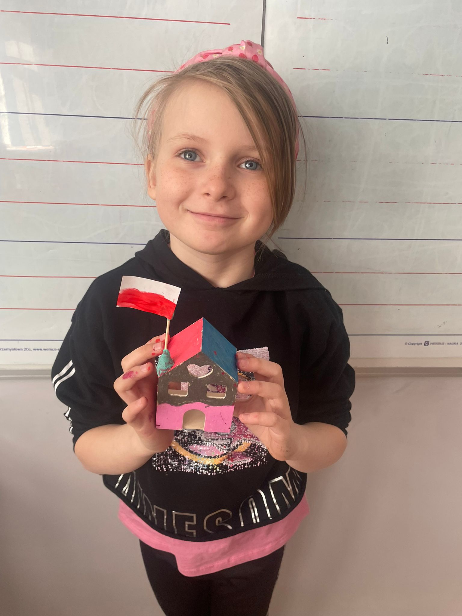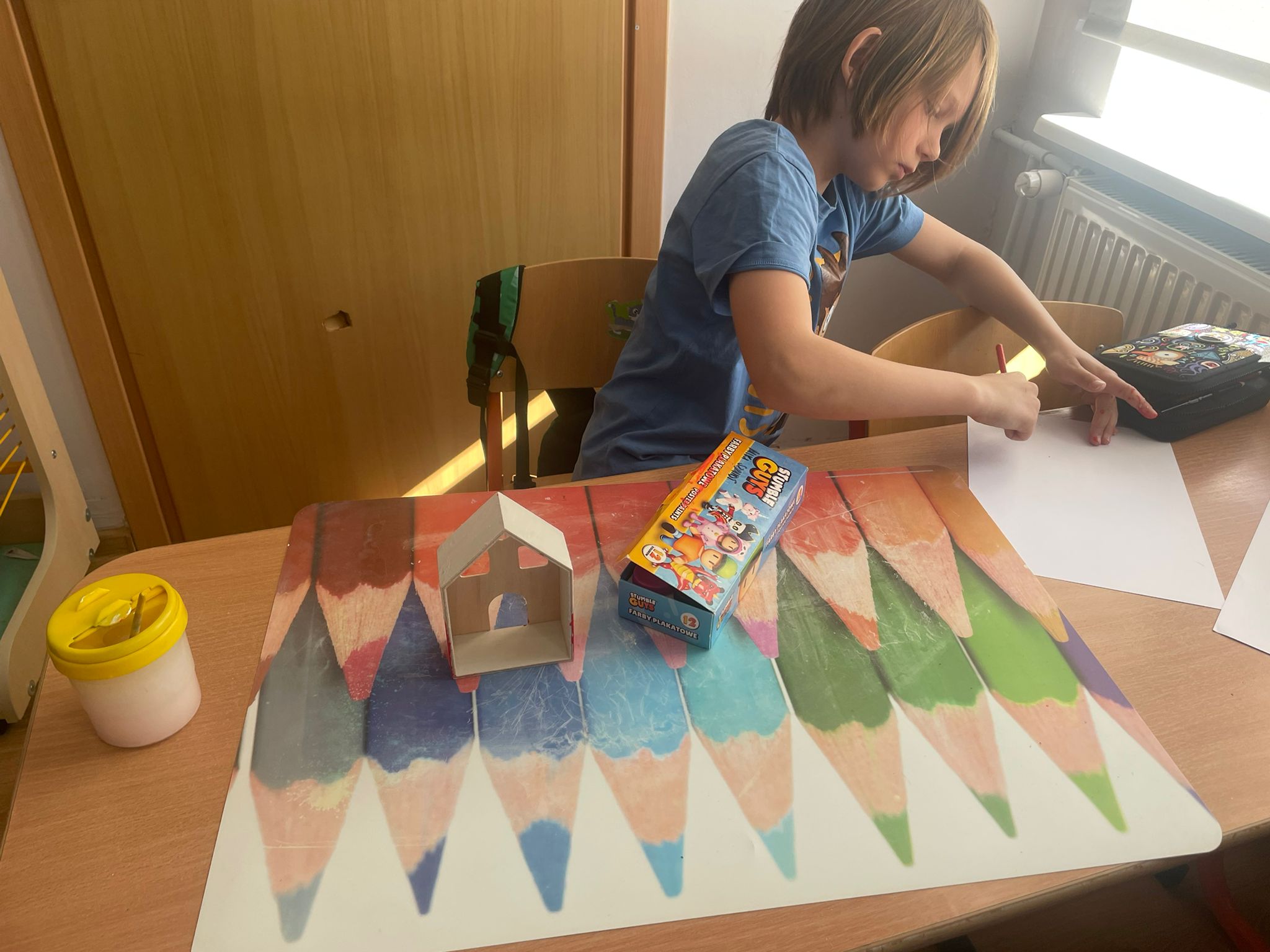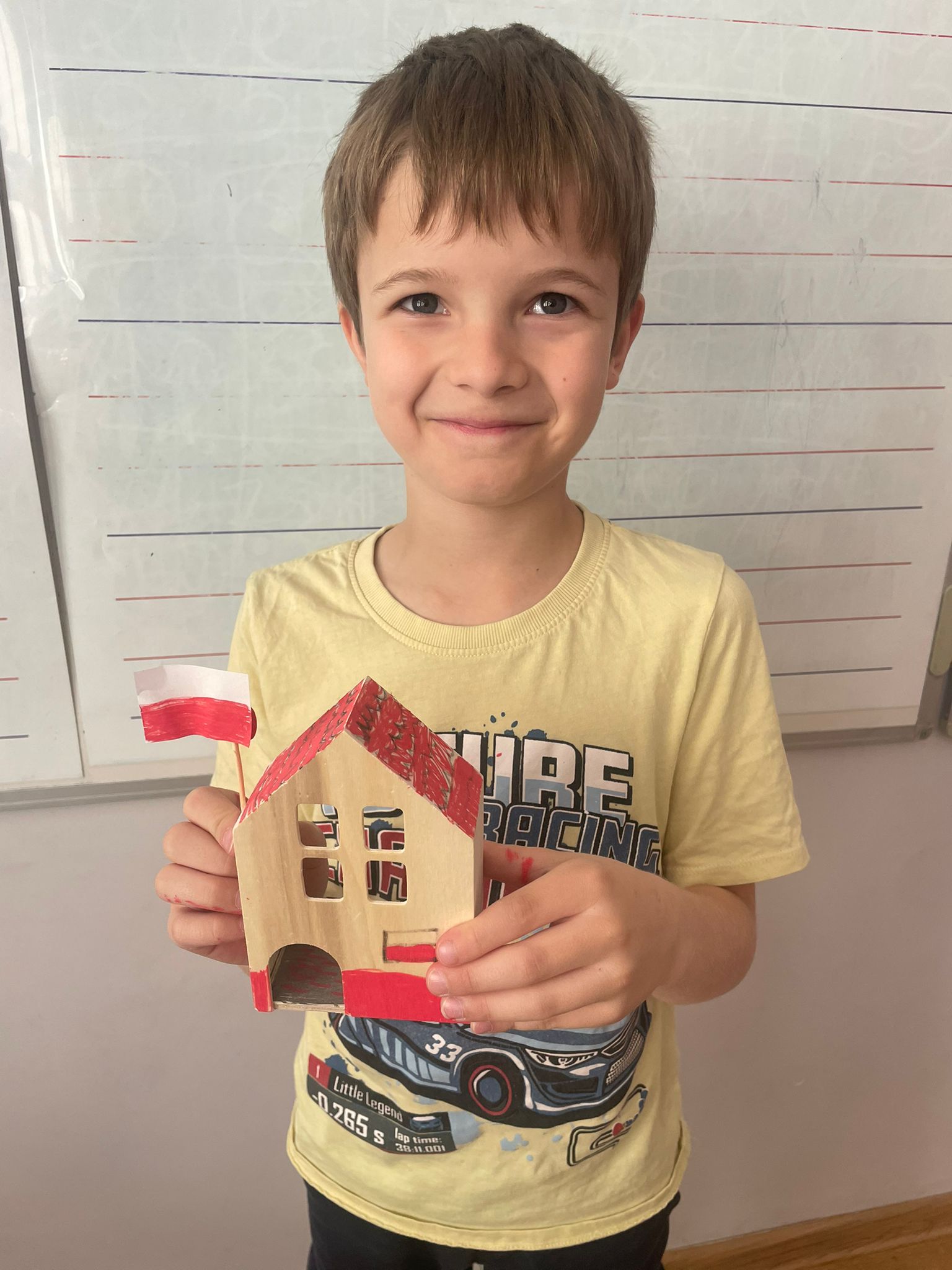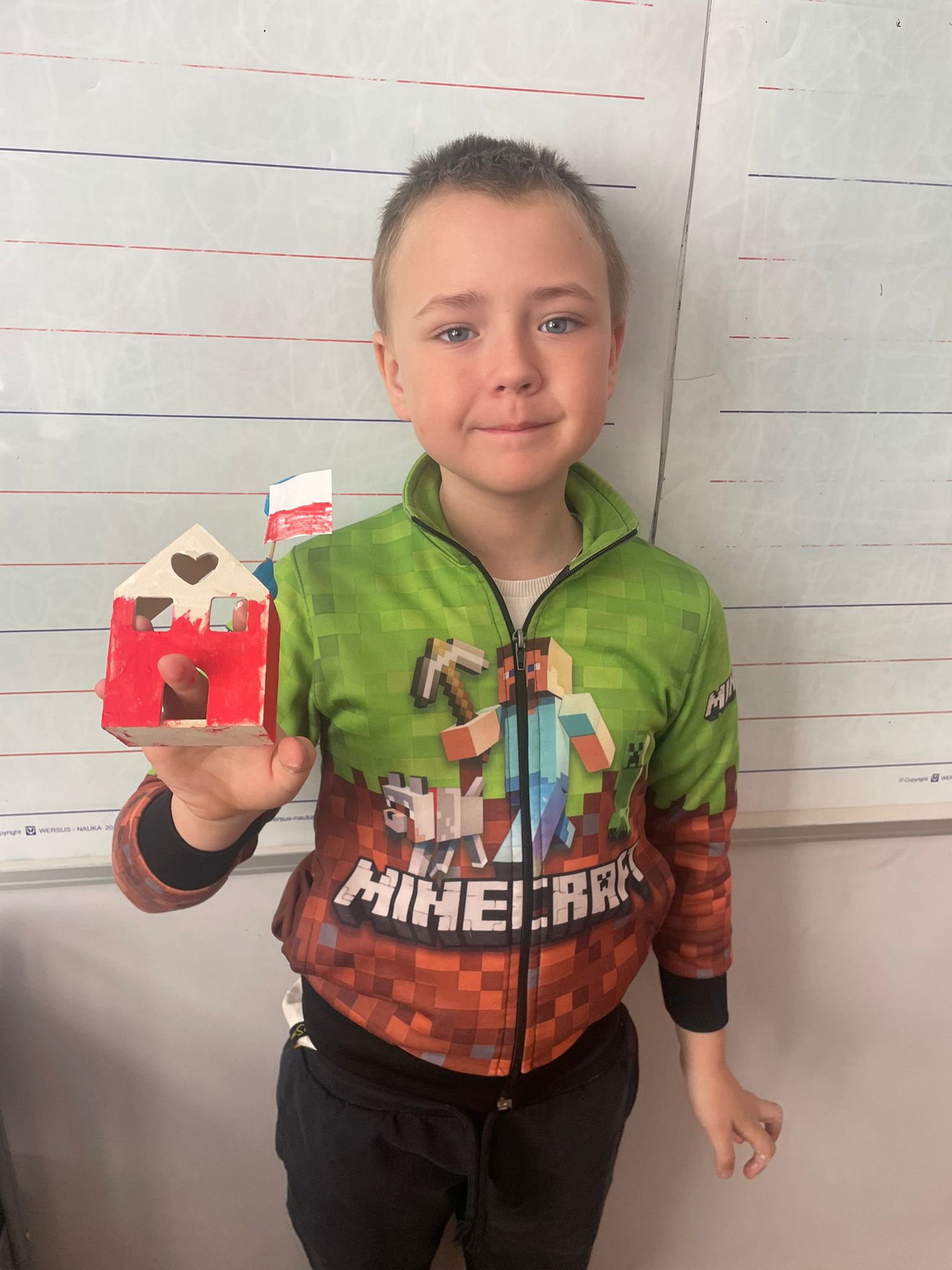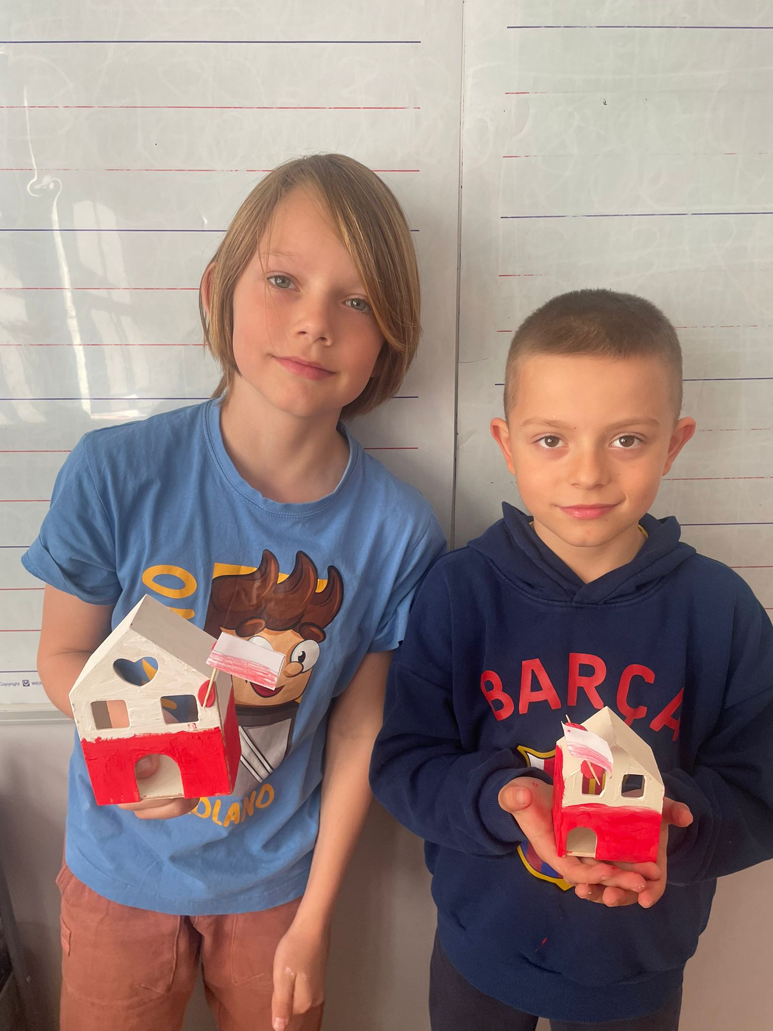 Uczniowie klas 2 i 3 na zajęciach wykonywali pracę plastyczną polegającą na malowaniu gotowych drewnianych domków. Każde dziecko samodzielnie dobierało kolory i sposób wykończenia, dzięki czemu powstały wyjątkowe, pełne wyobraźni projekty. Na zdjęciach widać proces twórczy - od wyboru barw, przez staranne malowanie detali, aż po prezentację gotowych prac. Kolorowe domki pokazują kreatywność uczniów oraz ich zaangażowanie w realizację tematu "Mój dom- moja ojczyzna"