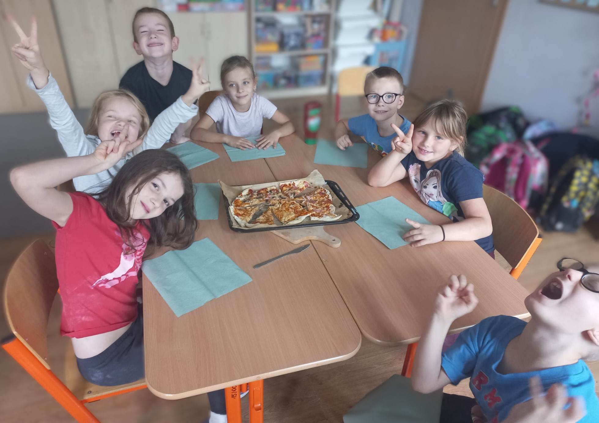 Na zajęciach kuchcikowo uczniowie klasy 1 z Panią Magdaleną Senger robili pizzę. Najpierw przygotowali ciasto odmierzając odpowiednią ilość składników potem starannie układali dodatki a na koniec degustowali pięknie wygladające danie. Wszyscy jednogłośnie stwierdzili, że była pyszna.