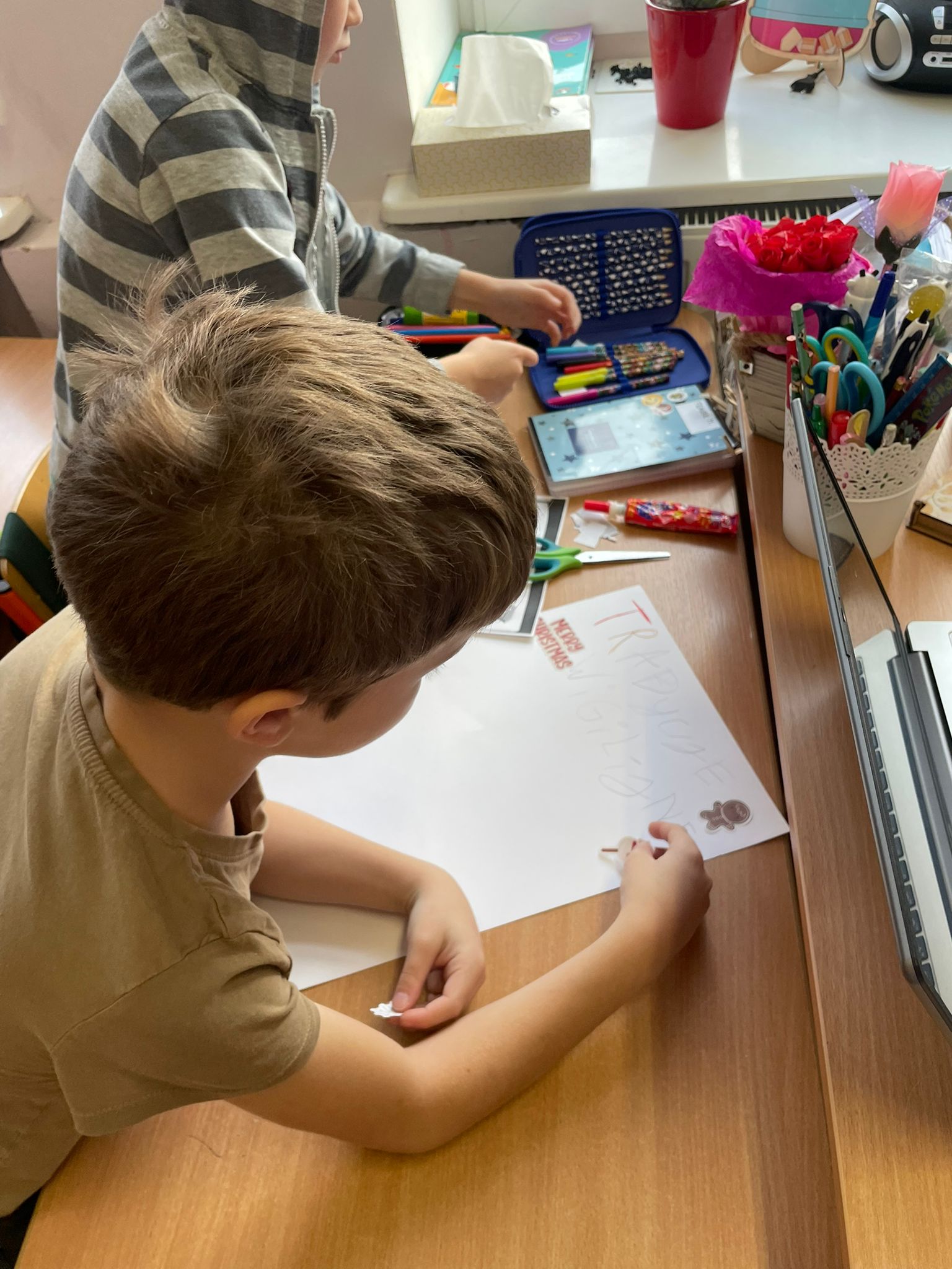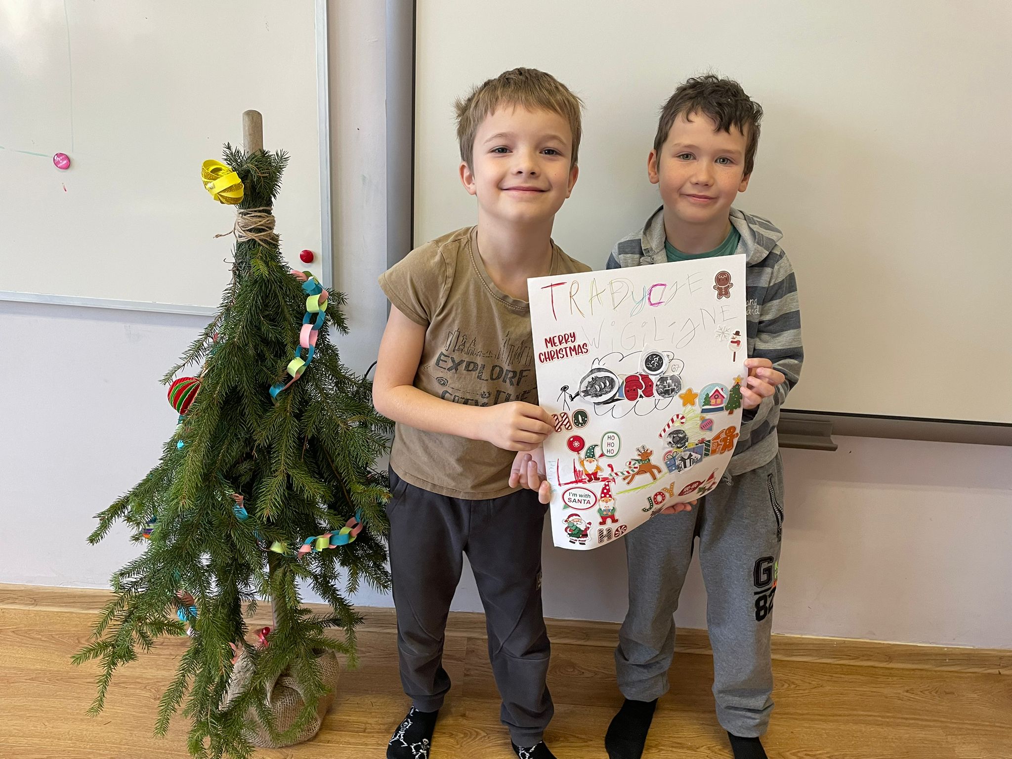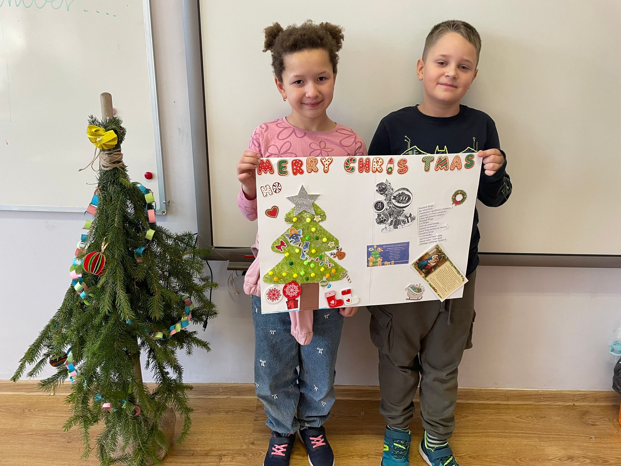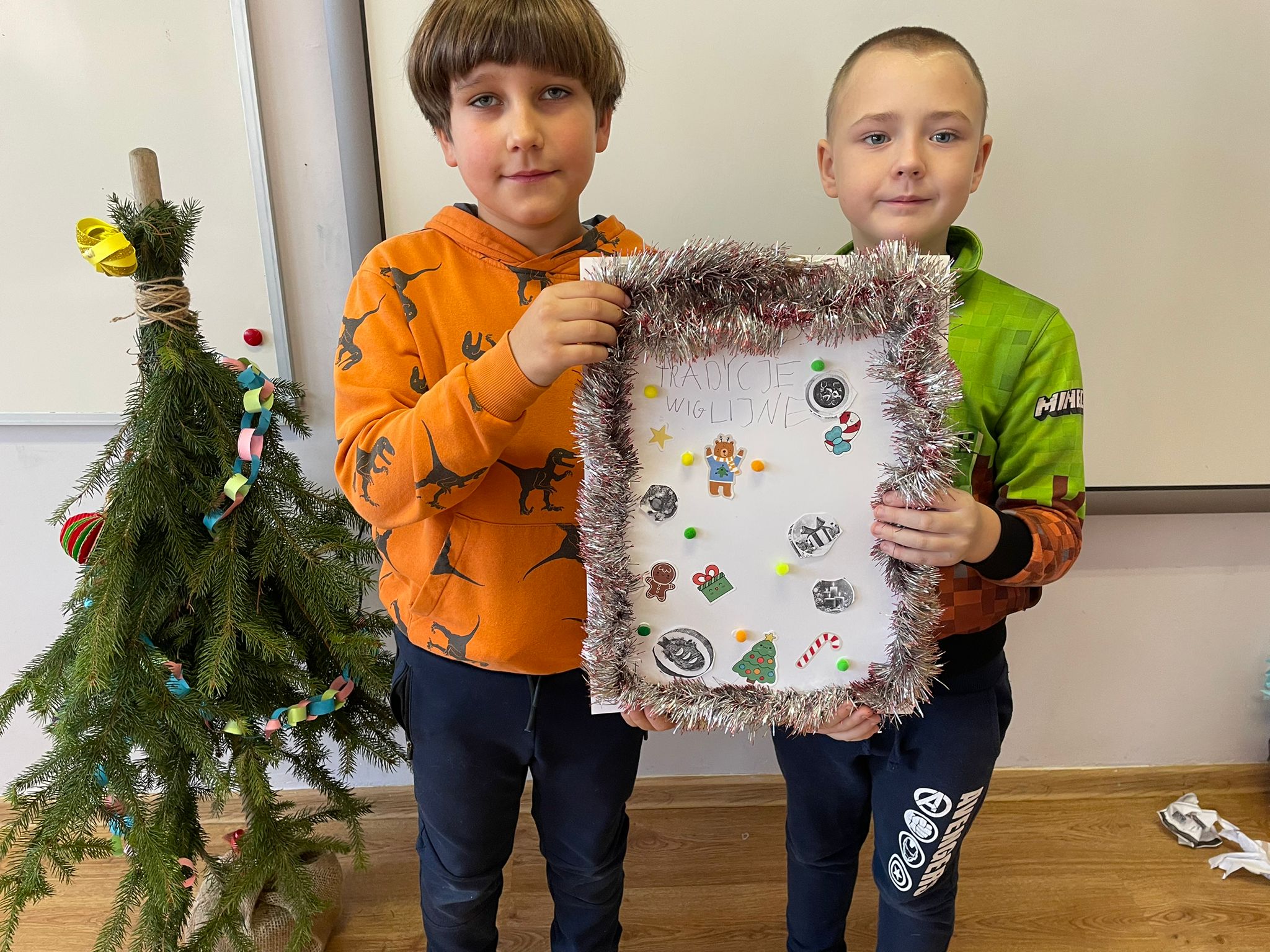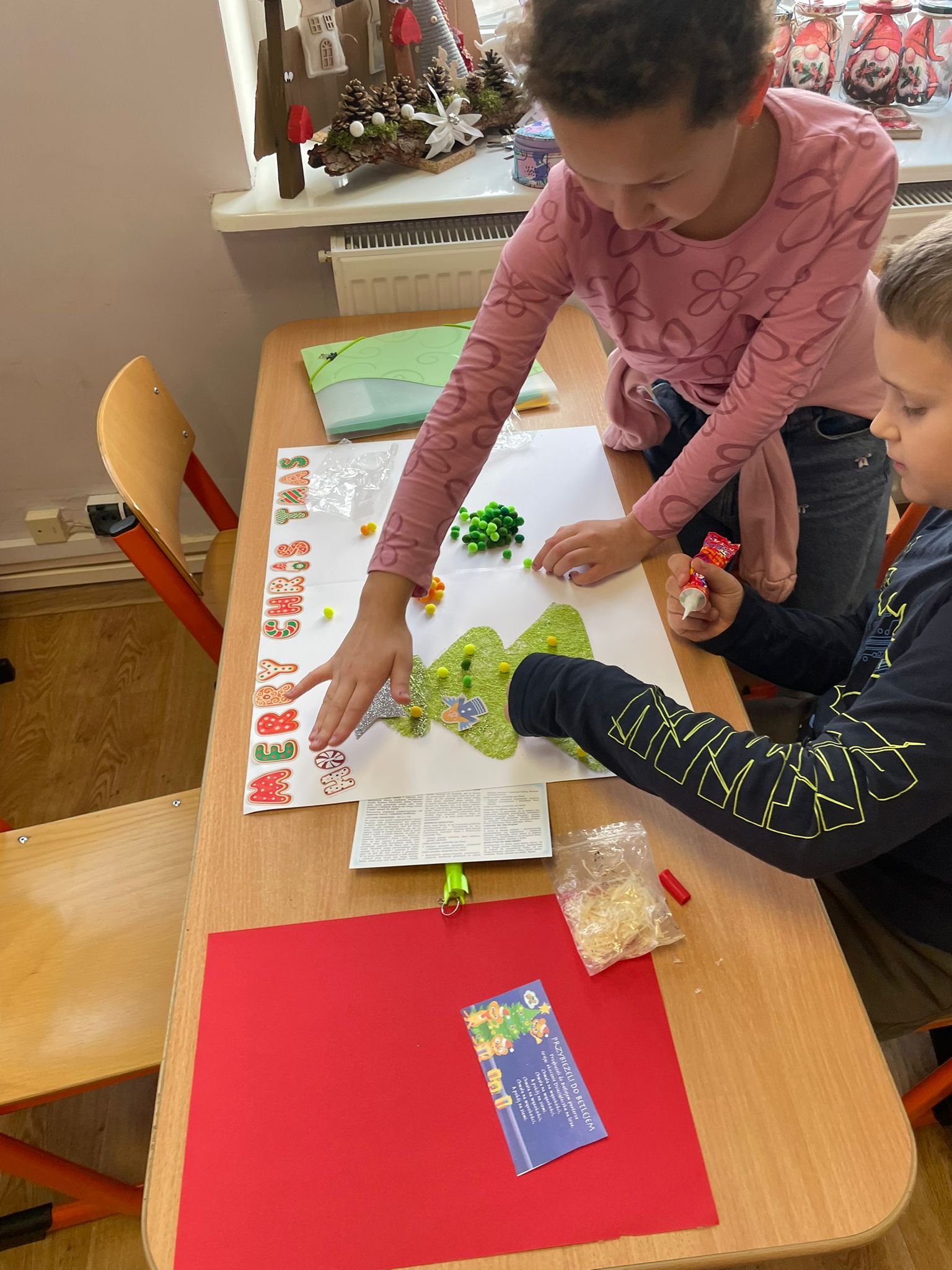 Podczas zajęć uczniowie klasy 2 pracowali w parach nad przygotowaniem plakatów przedstawiających tradycje bożonarodzeniowe w naszym kraju. W szkolnej klasie panowała twórcza, pełna energii atmosfera - stoły zapełniły się kolorowymi kartkami, ilustracjami, wycinankami i notatkami, a uczniowie z zaangażowaniem omawiali swoje pomysły i dzielili sie zadaniami. Wszystkie plakaty wyszły cudowne.