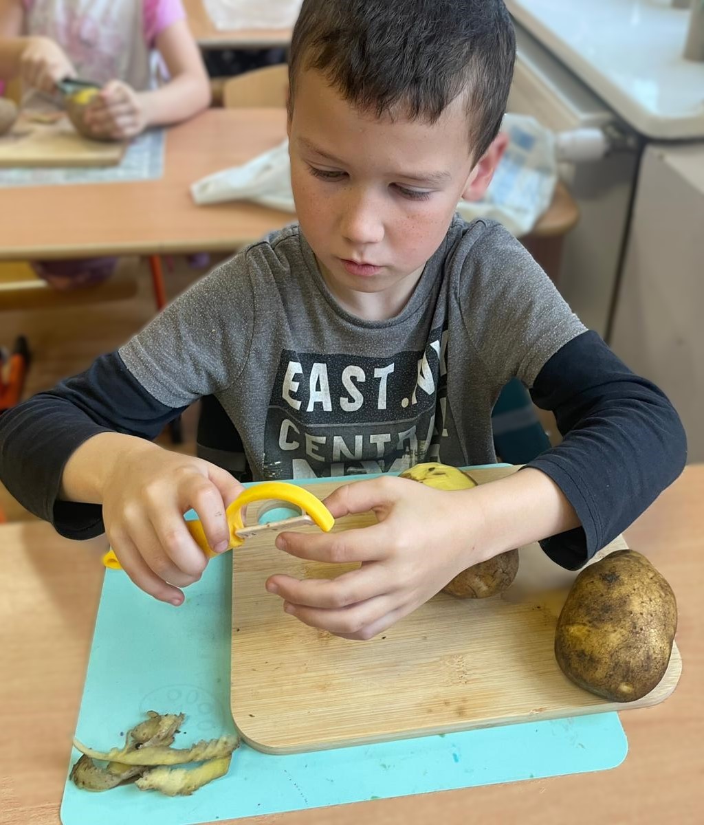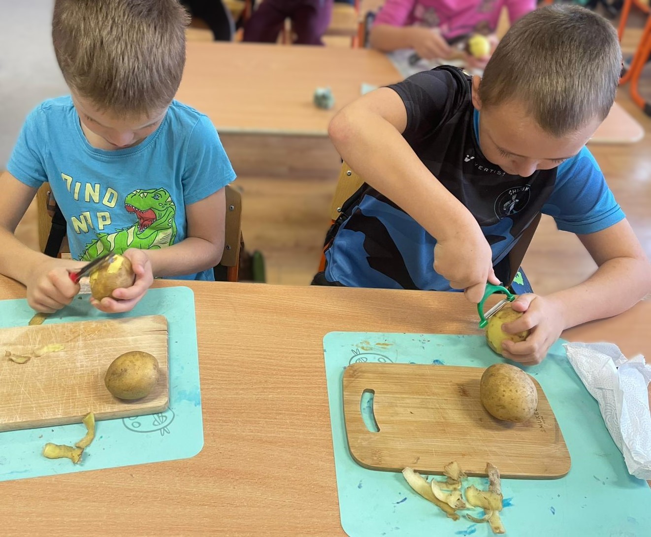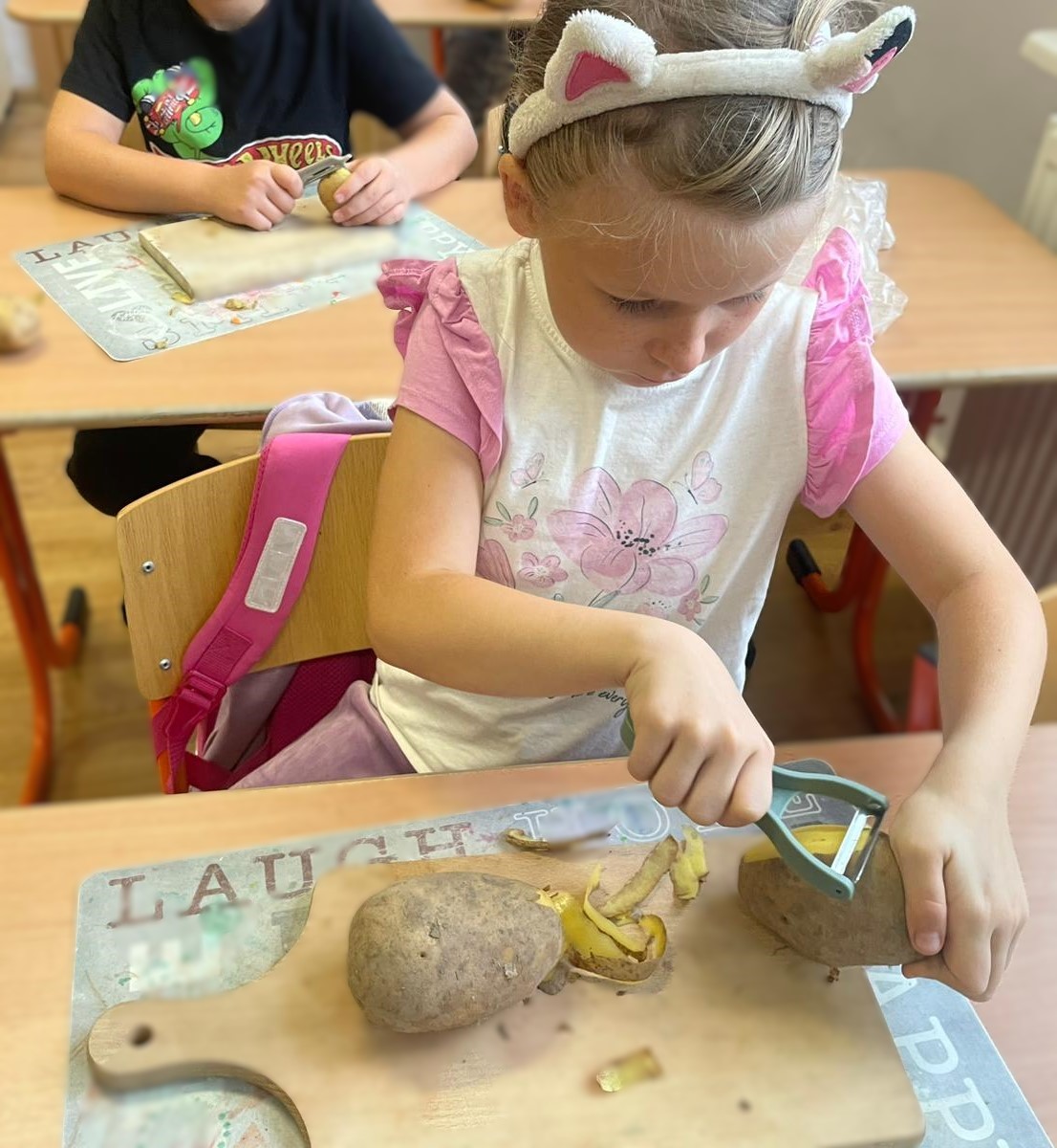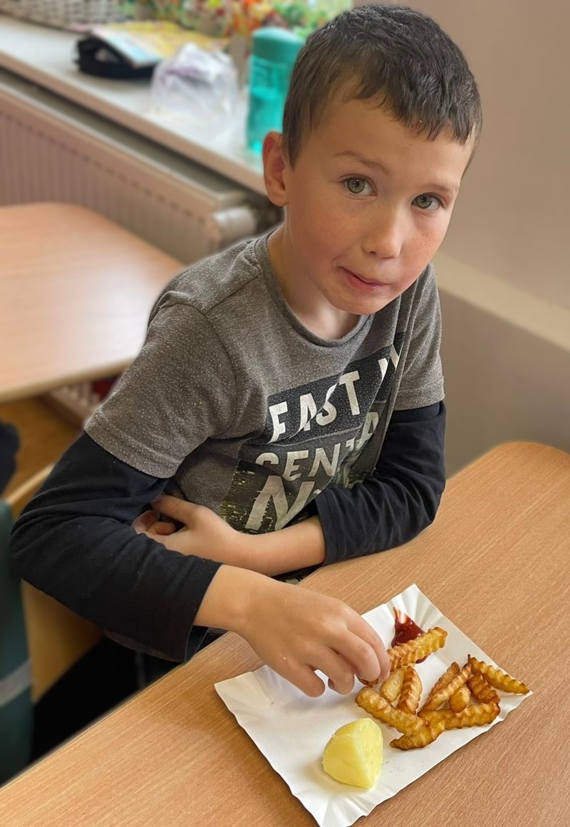 Podczas zajęć uczniowie klasy 2 mieli okazję odkrywać, jak wiele smacznych potraw można przygotować z ziemniaków. Dzięki pracy dzieci mogliśmy skosztować: chrupiące placki, gotowane ziemniaki z ziołami oraz lubiane przez wszystkich frytki. Dzieci pracowały w grupach, samodzielnie obierały, kroiły i tarły ziemniaki. Było dużo śmiechu, współpracy i radości z tworzenia czegoś własnego. Na zajęciach widać było zaangażowanie uczniów, ich pomysłowość oraz dumę z efektów pracy. To była prawdziwa uczta dla oka i podniebienia.