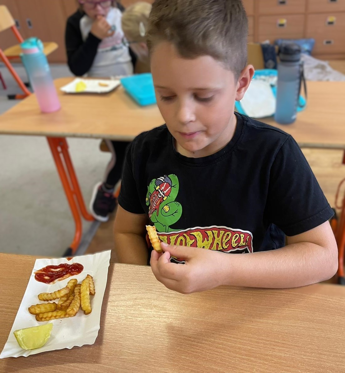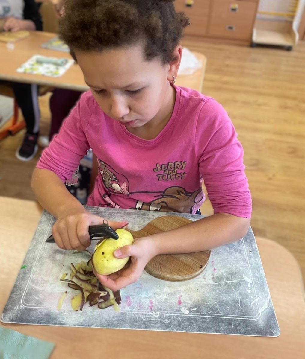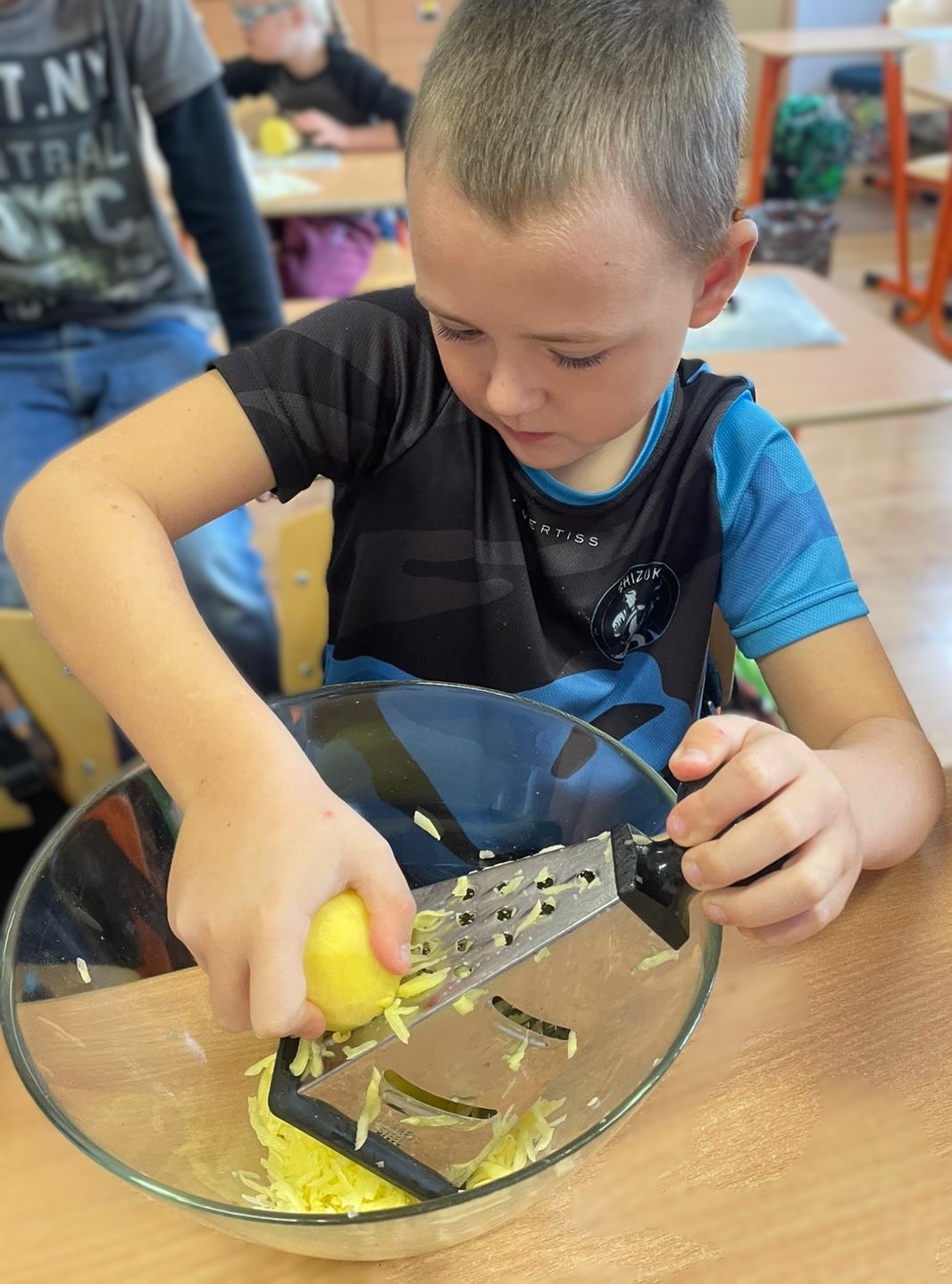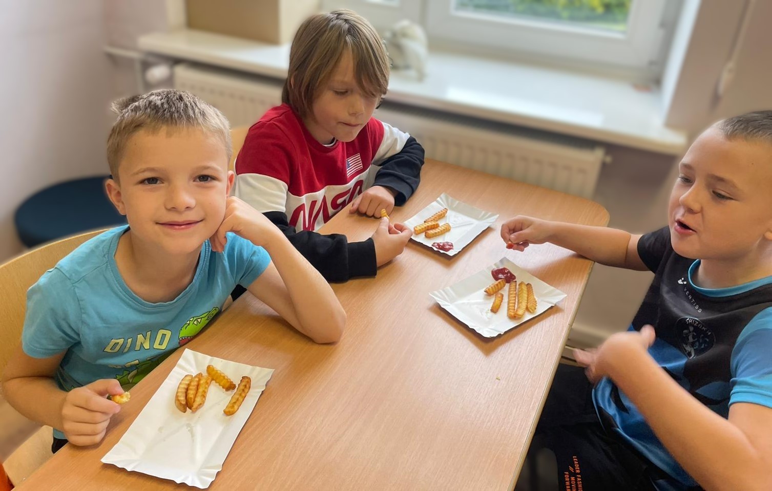 Podczas zajęć uczniowie klasy 2 mieli okazję odkrywać, jak wiele smacznych potraw można przygotować z ziemniaków. Dzięki pracy dzieci mogliśmy skosztować: chrupiące placki, gotowane ziemniaki z ziołami oraz lubiane przez wszystkich frytki. Dzieci pracowały w grupach, samodzielnie obierały, kroiły i tarły ziemniaki. Było dużo śmiechu, współpracy i radości z tworzenia czegoś własnego. Na zajęciach widać było zaangażowanie uczniów, ich pomysłowość oraz dumę z efektów pracy. To była prawdziwa uczta dla oka i podniebienia.