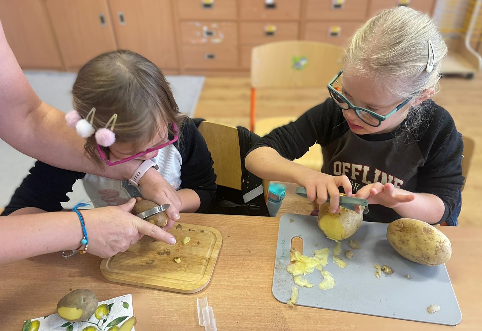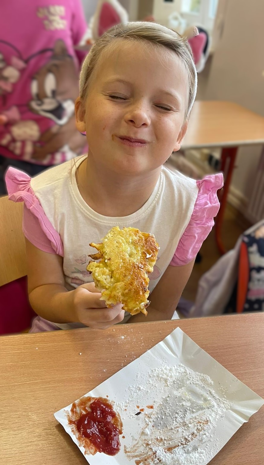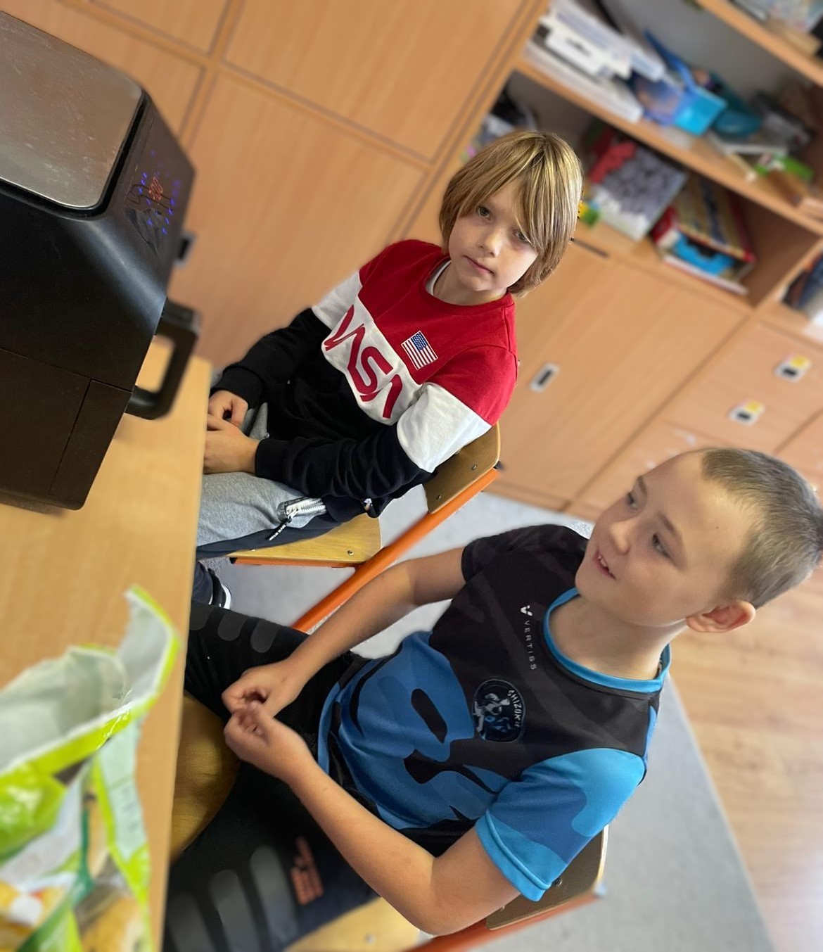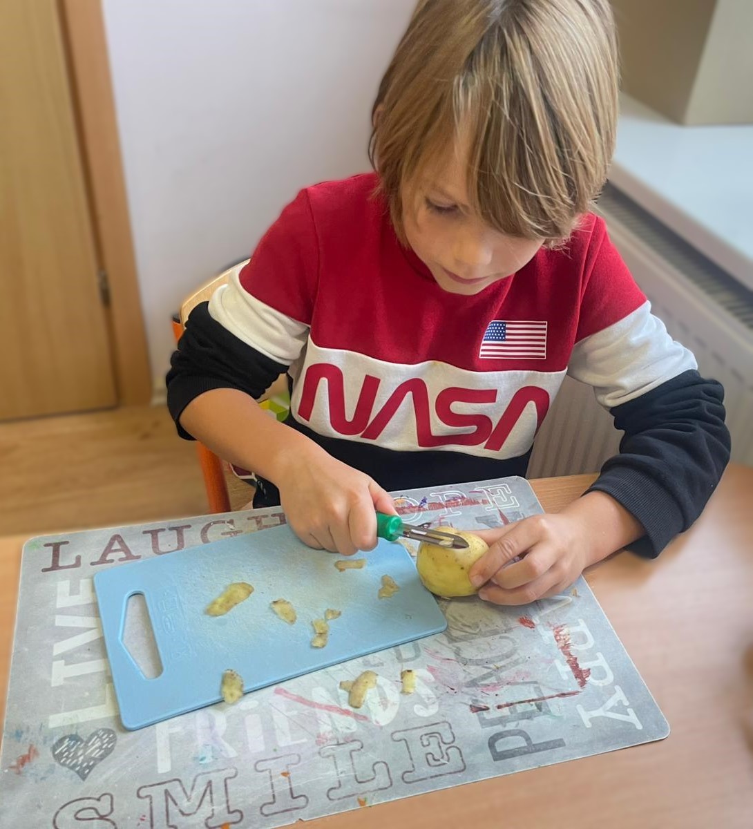 Podczas zajęć uczniowie klasy 2 mieli okazję odkrywać, jak wiele smacznych potraw można przygotować z ziemniaków. Dzięki pracy dzieci mogliśmy skosztować: chrupiące placki, gotowane ziemniaki z ziołami oraz lubiane przez wszystkich frytki. Dzieci pracowały w grupach, samodzielnie obierały, kroiły i tarły ziemniaki. Było dużo śmiechu, współpracy i radości z tworzenia czegoś własnego. Na zajęciach widać było zaangażowanie uczniów, ich pomysłowość oraz dumę z efektów pracy. To była prawdziwa uczta dla oka i podniebienia.