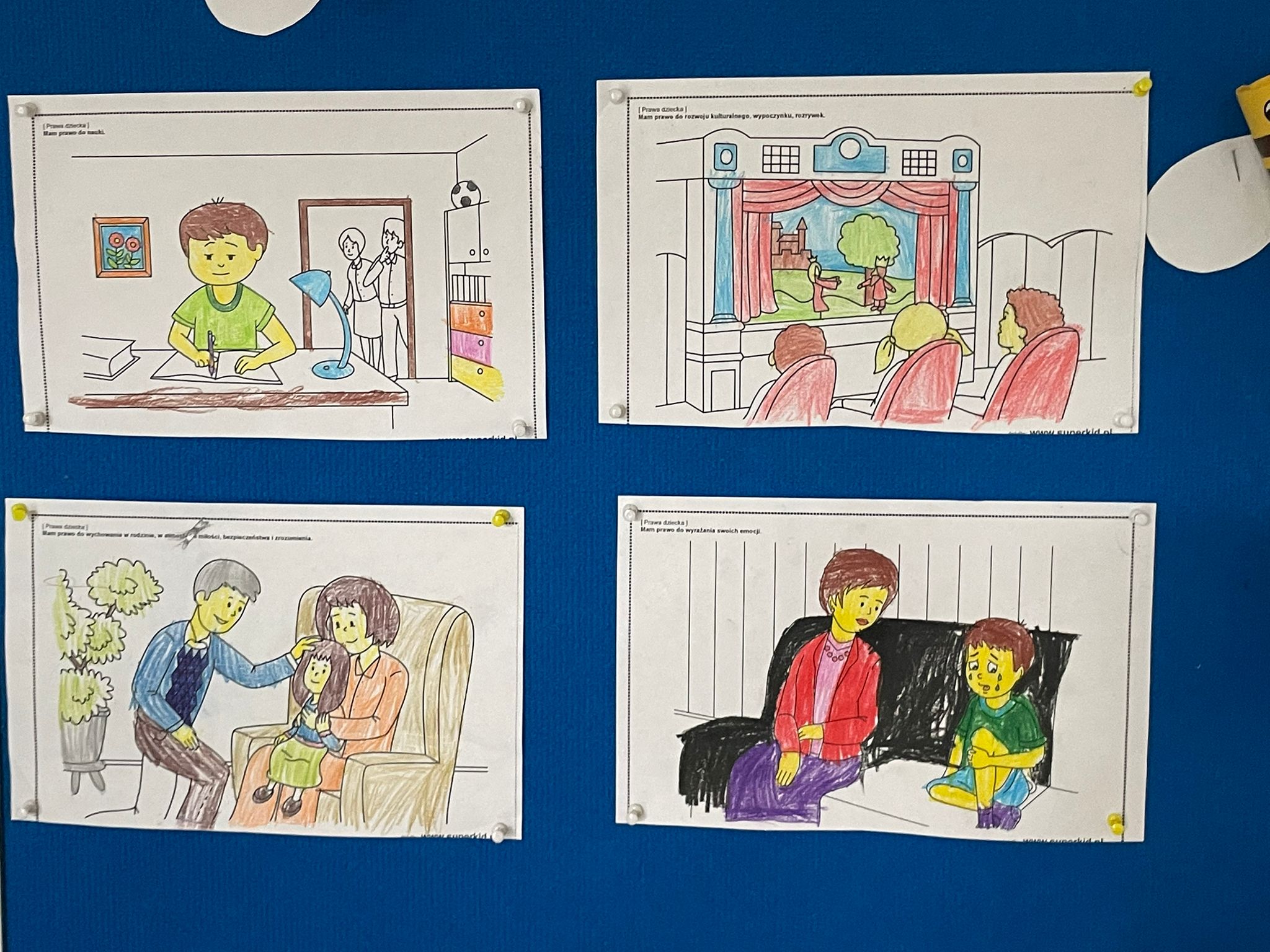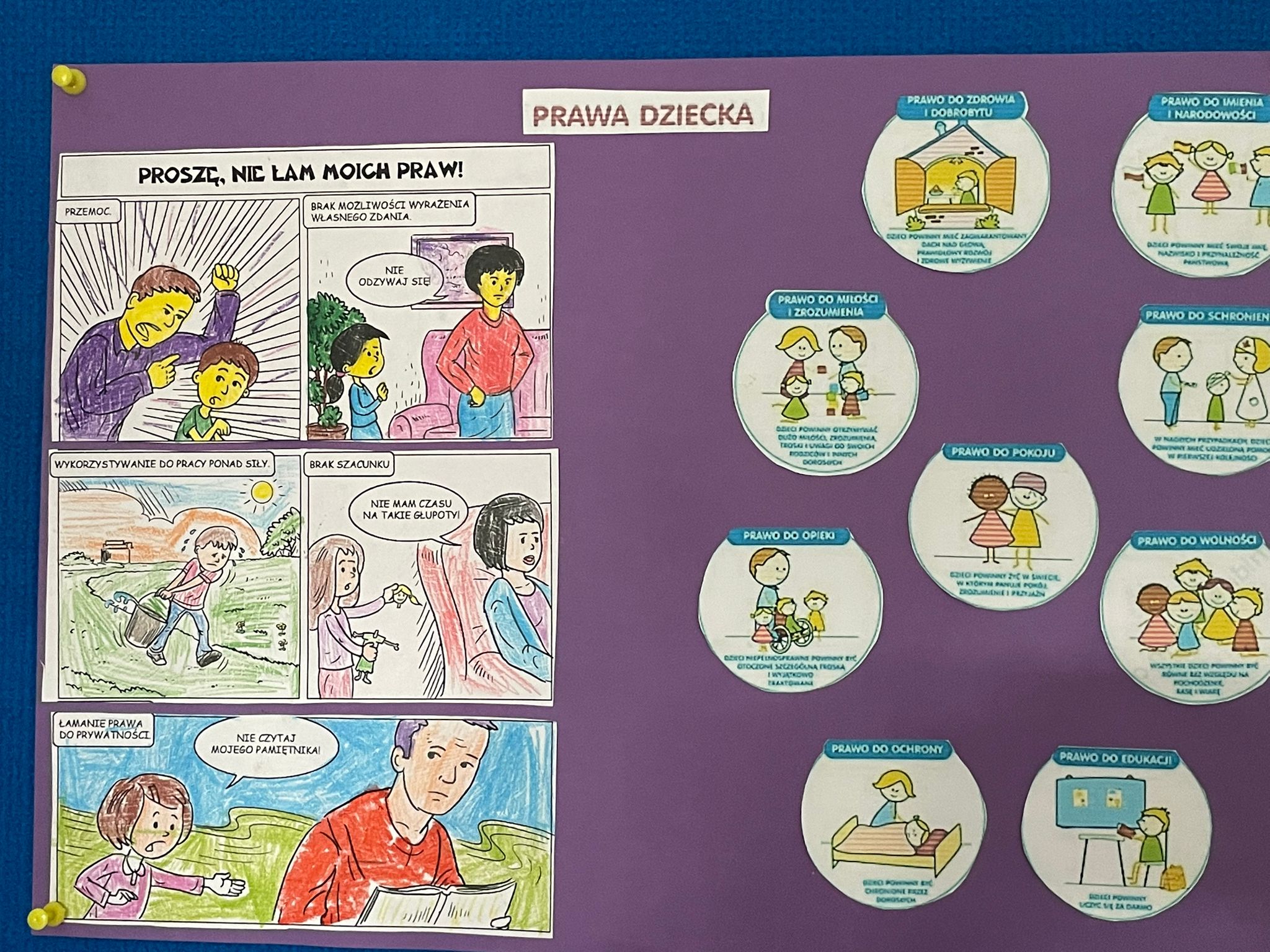 W dniu 02.06.2025r. w klasach 1-3 zostały przeprowadzone zajęcia dotyczące Praw Dziecka. Uczniowie podczas lecji mogli zdobyć wiedzę odnośnie praw i obowiązków dzieci przedstawionej w formie komiksu. Na koniec zajęć pokolorowali ilustrację i utworzyli z tego kolaż prac.