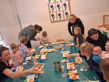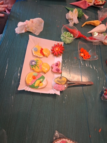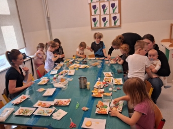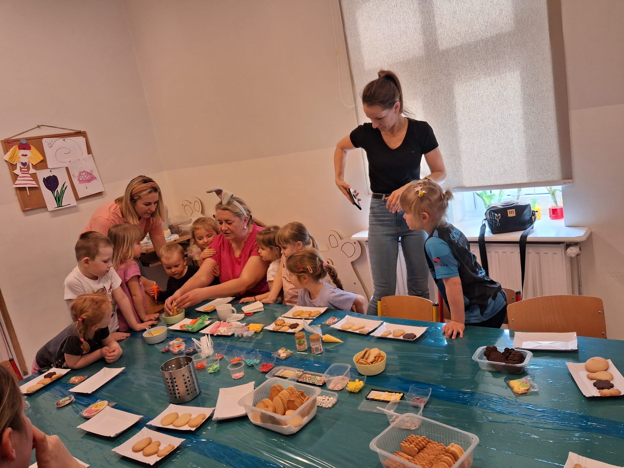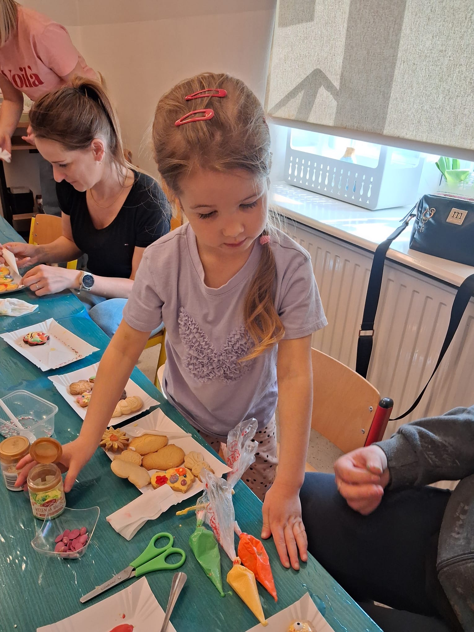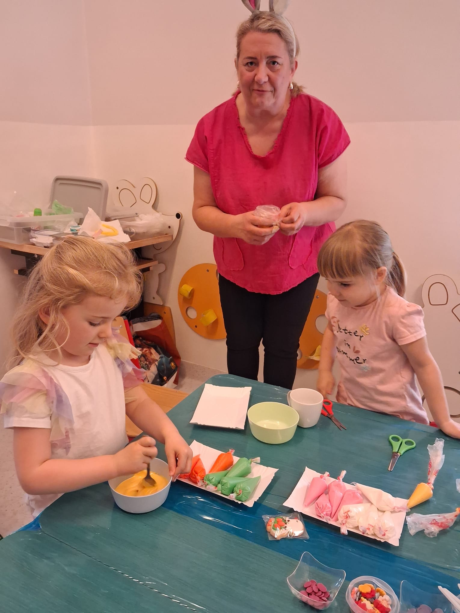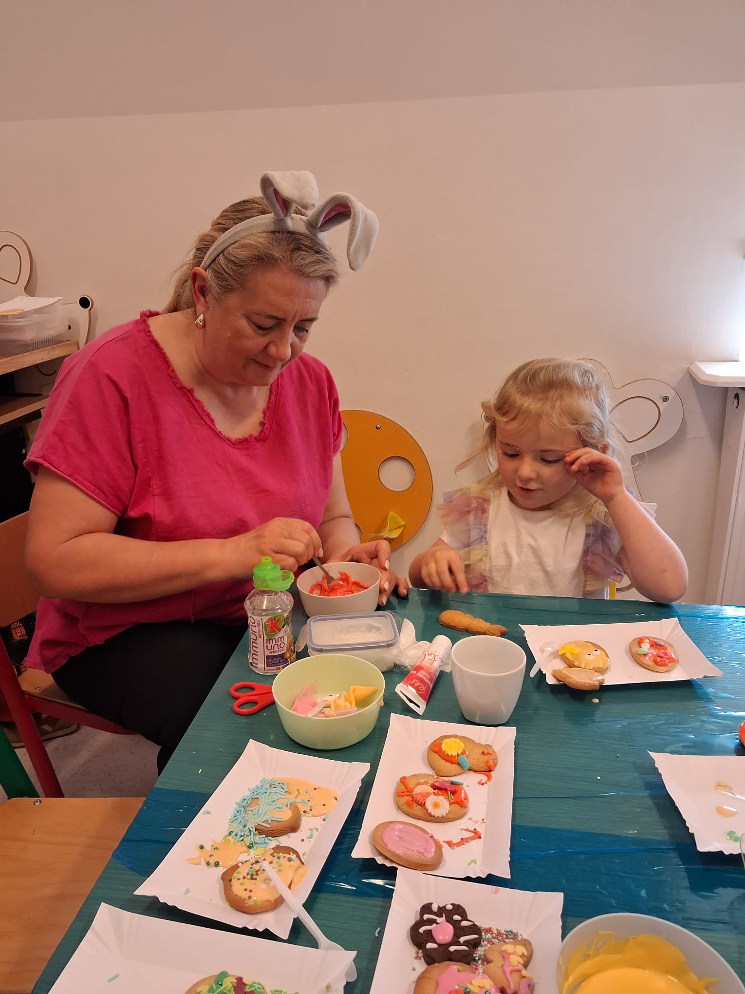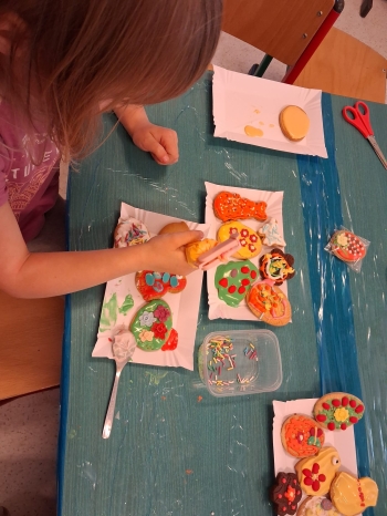 W grupie Jeżyków dzieci tworzyły wspaniałe stroiki wielkanocne, poszukiwały prezentów od Zająca na szkolnym placu zabaw, a także wzięły udział w rodzinnych warsztatach "Mali cukiernicy". Przepyszne wypieki, śliczne ozdoby oraz słodkie lukry przygotowała dla nas wspaniała babcia jednej z dziewczynek - Pani Basia. Pod jej okiem rodzice z dziećmi stworzyli przepiękne, kolorowe ciasteczka wielkanocne.