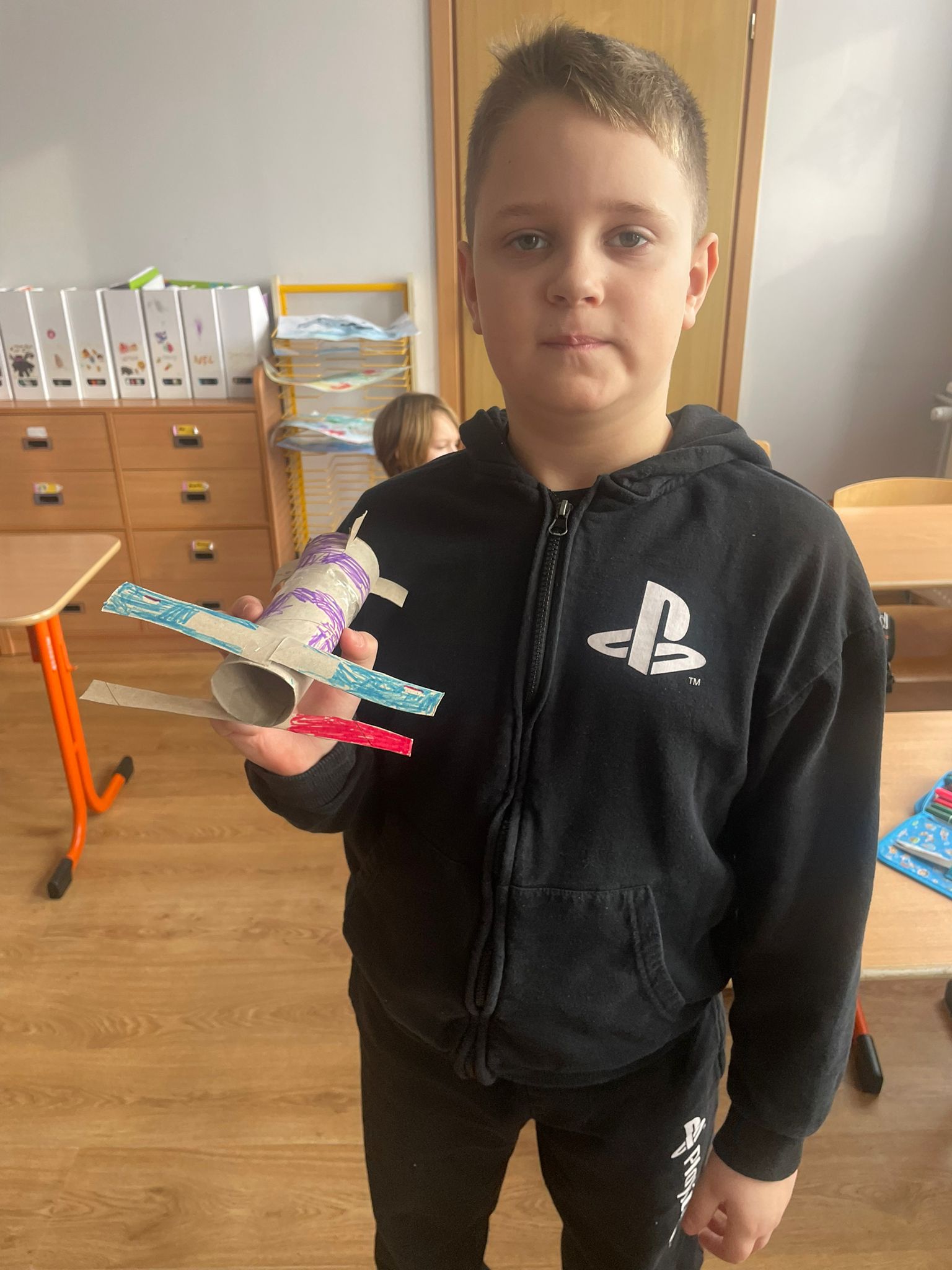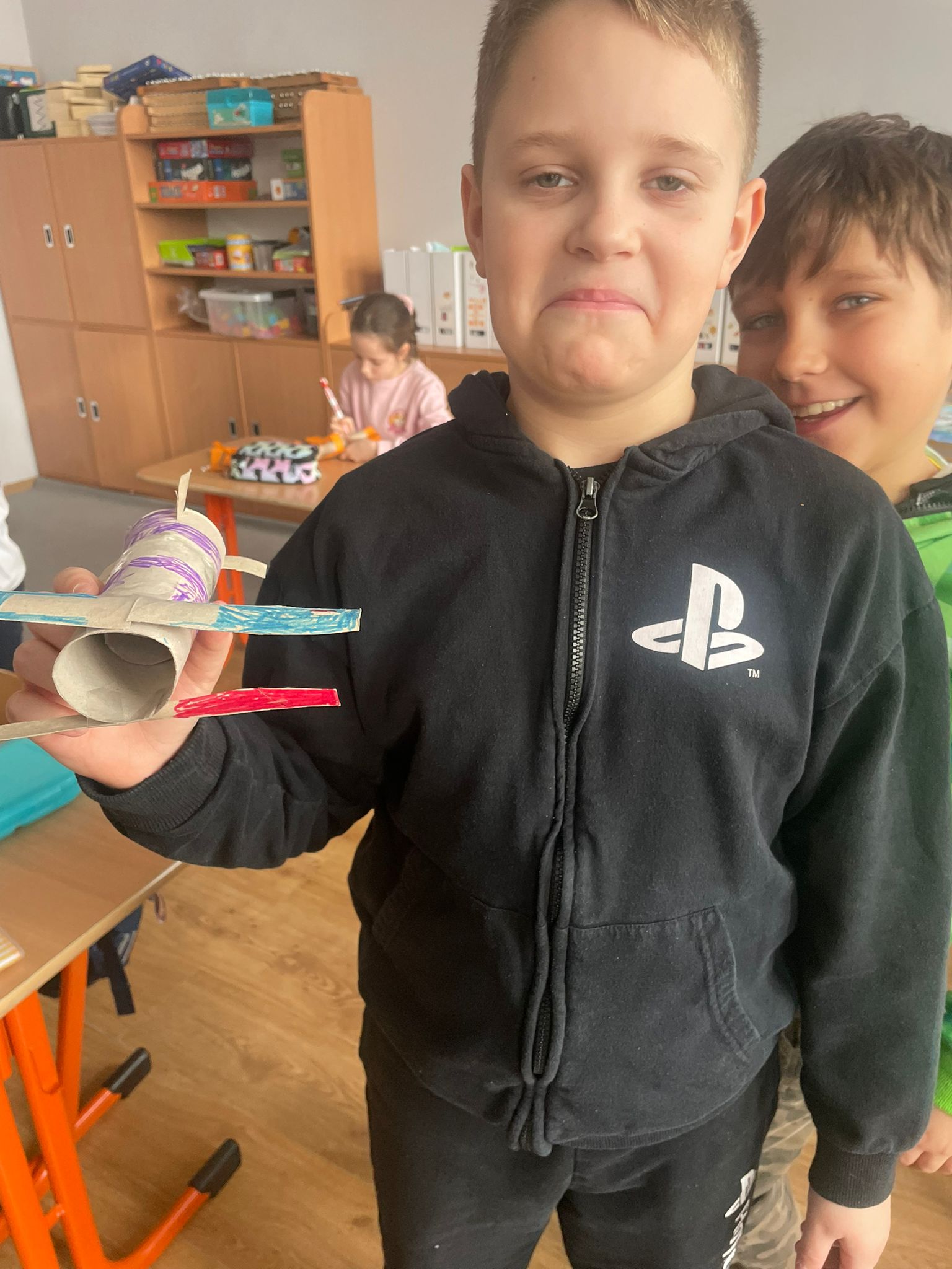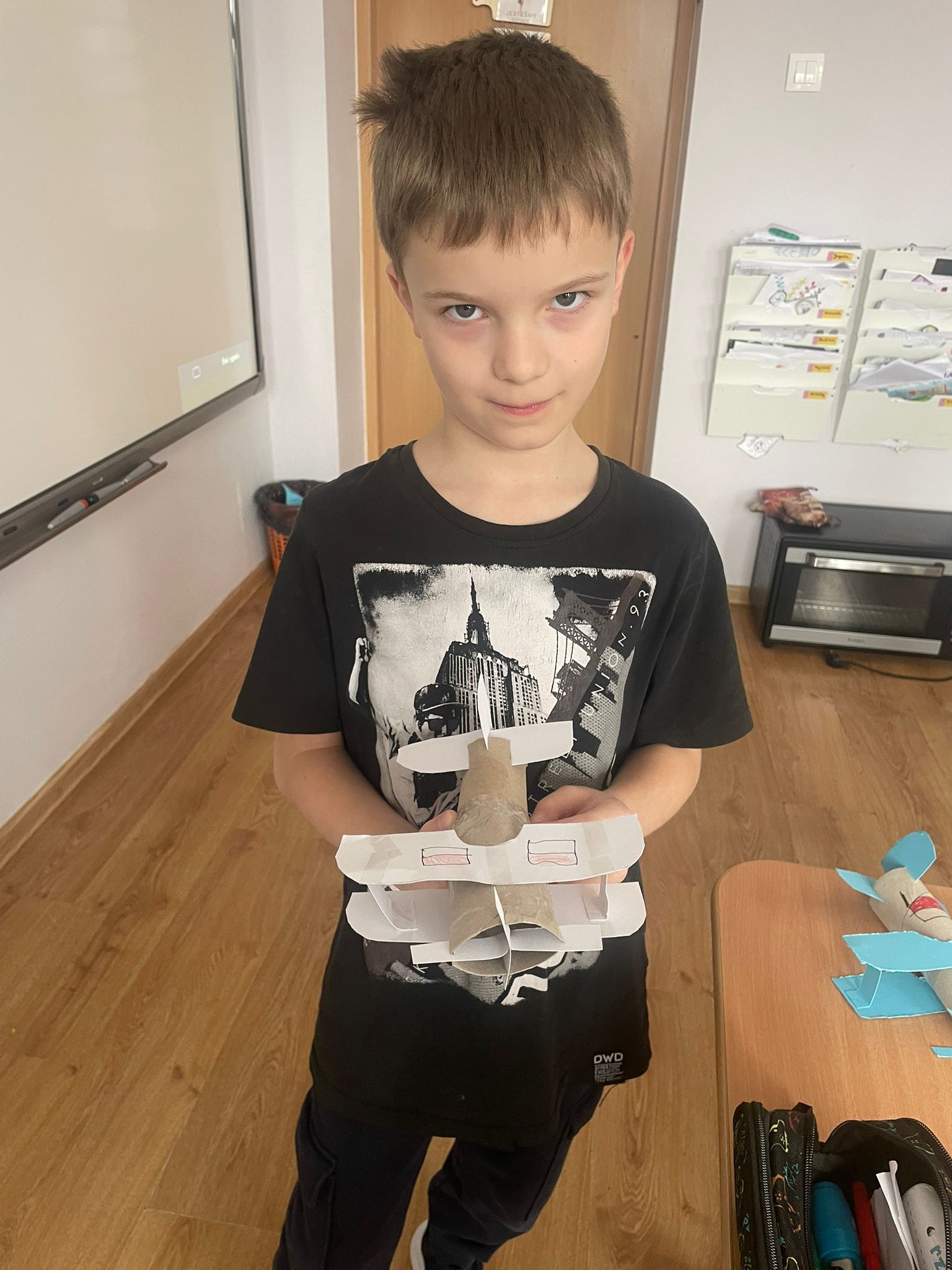 Uczniowie klasy 2 i 3 z zaangażowaniem tworzyli własne samoloty, łącząc zabawę z rozwijaniem wyobraźni i zdolności manualnych. Podczas zajęć dzieci projektowały kształty, składały elementy i testowały swoje konstrukcje, ucząc się przy tym precyzji, cierpliwości oraz współpracy. W twórczej atmosferze powstały różnorodne modele. Zdjęcia ukazują radość, skupienie i satysfakcję z samodzielnie wykonanej pracy, która stała się dla uczniów okazją do kreatywnego działania i wspólnej zabawy.