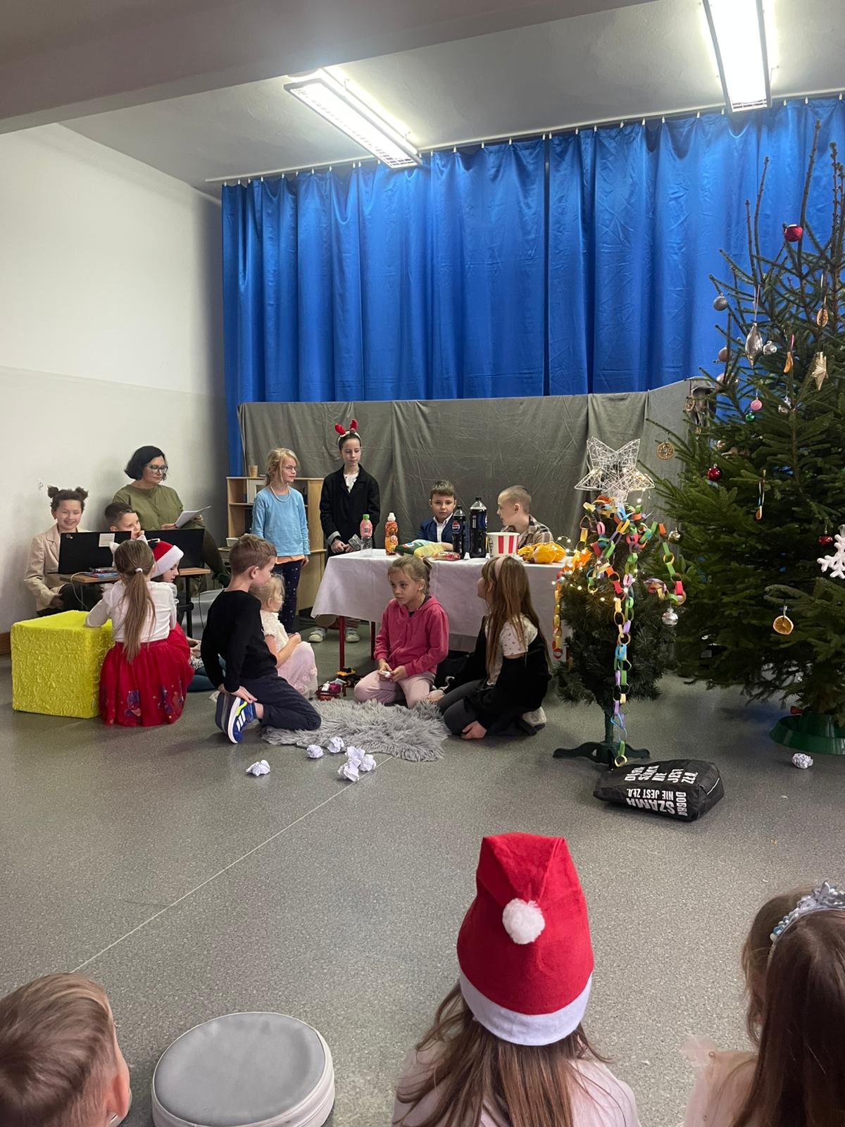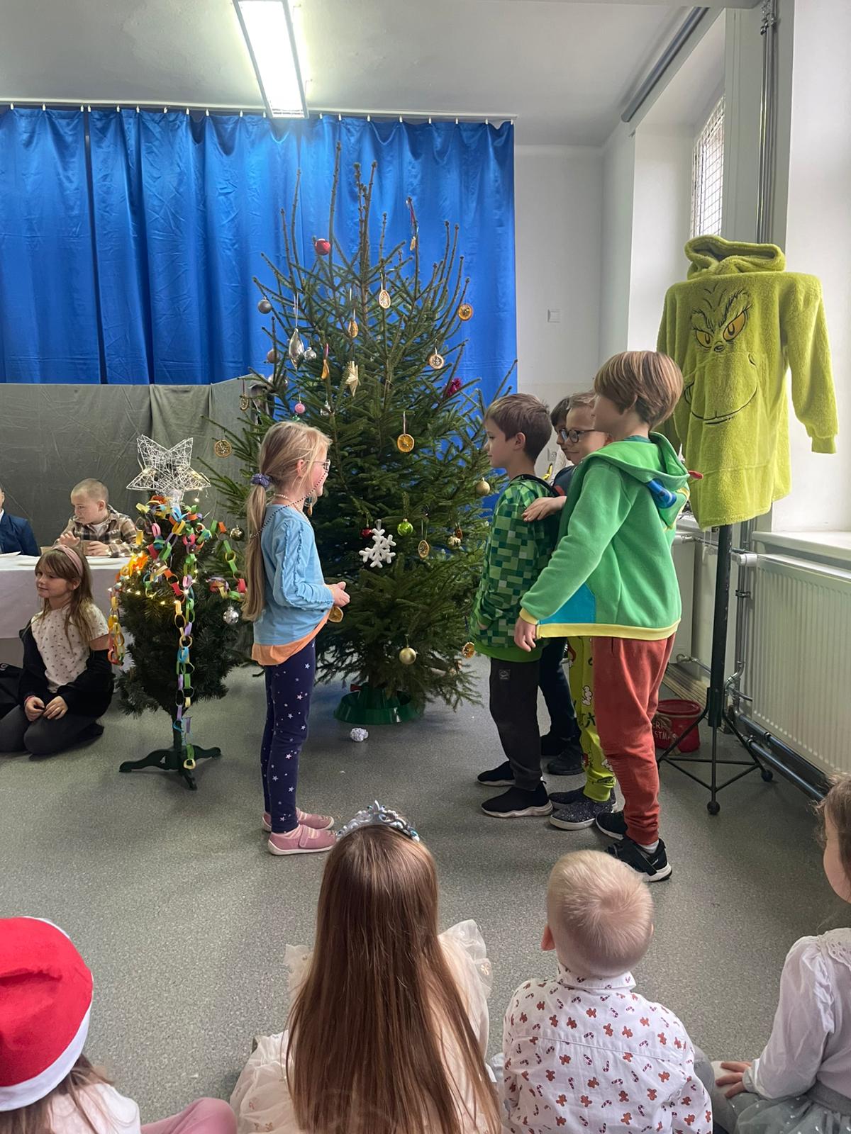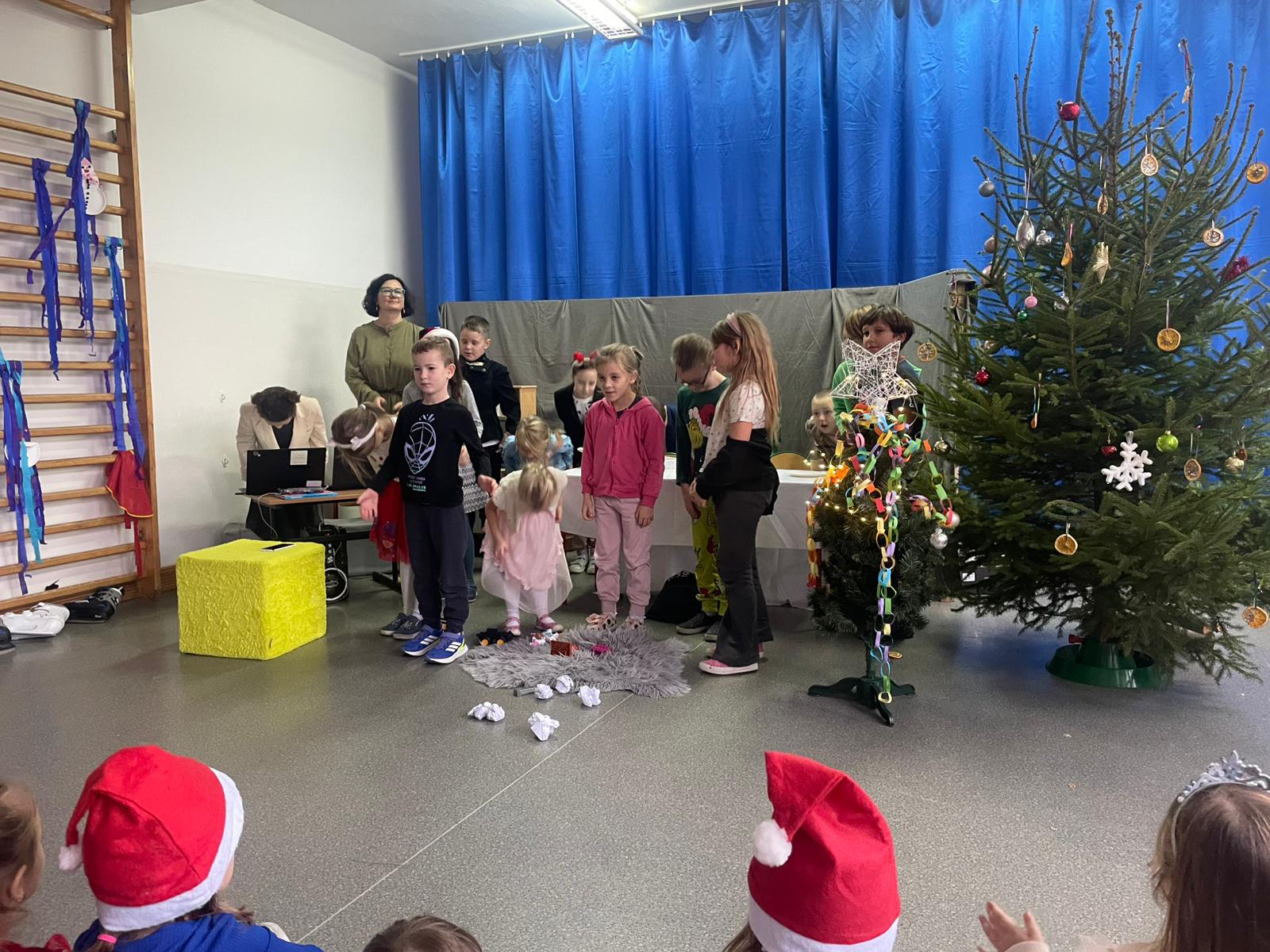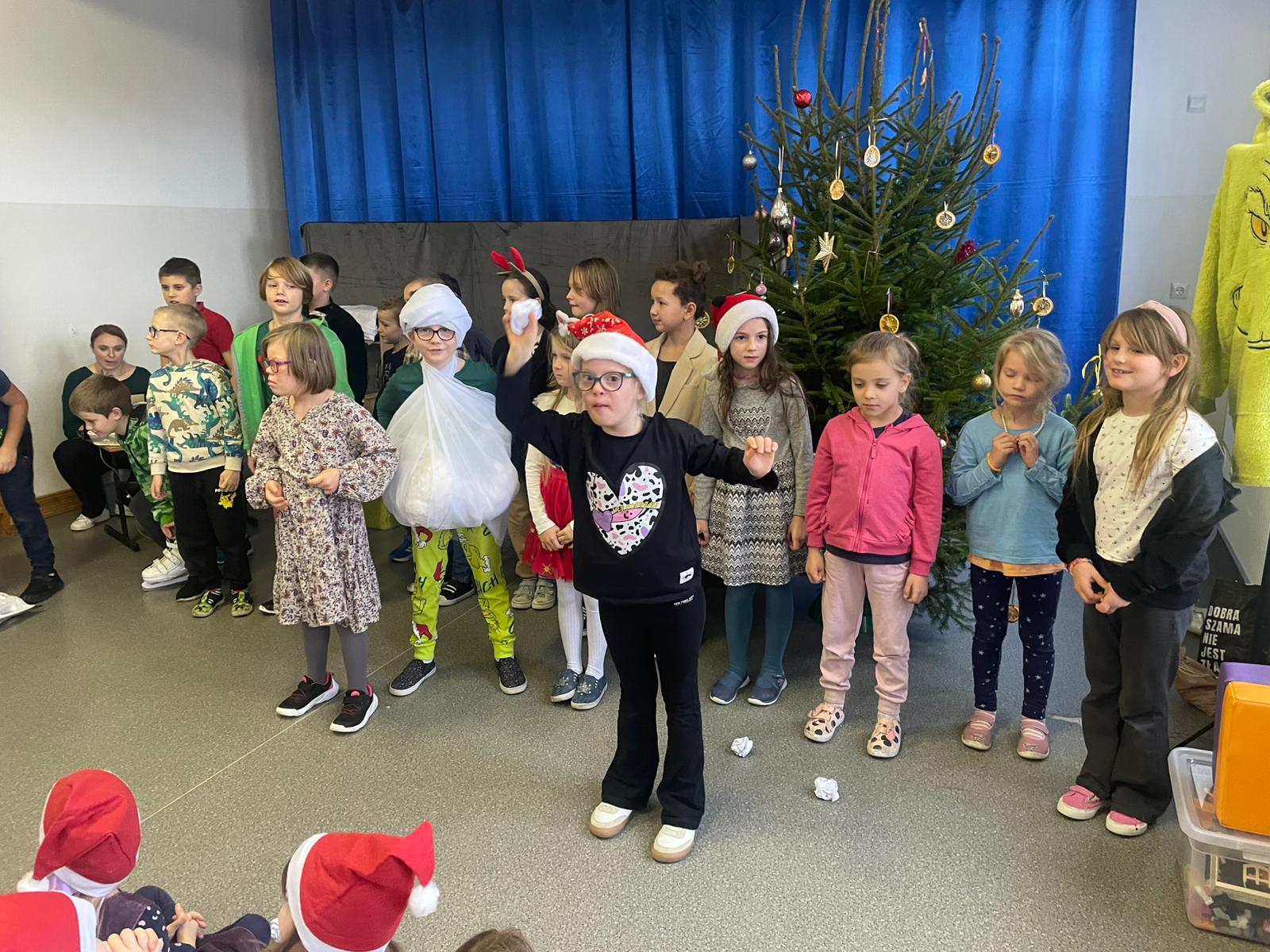W dniu 12.12.2025 roku w naszej szkole zorganizowaliśmy występy uczniów i przedszkolaków dla gości ze Środowiskowego Domu Samopomocy z Marszewskiej Góry .Dzieci pięknie się zaprezentowały śpiewając piosenki po polsku i angielsku. Wystawiliśmy też spektakl teatralny o przygotowaniach świątecznych, które uparcie próbowało zakłócić czterech "zielonych stworów". Atmosfera była bardzo wzruszająca. Po części artystycznej wypiliśmy wspólnie zimową herbatę i zaśpiewaliśmy kilka kolęd.