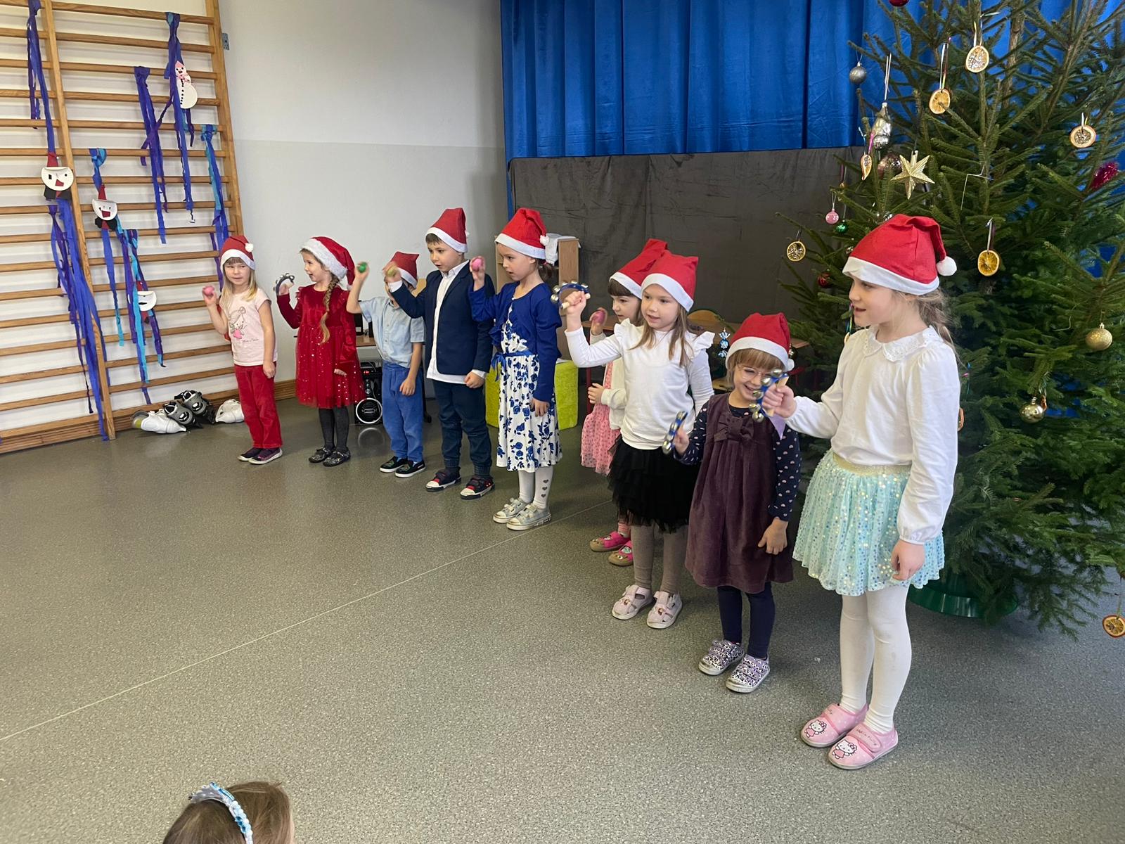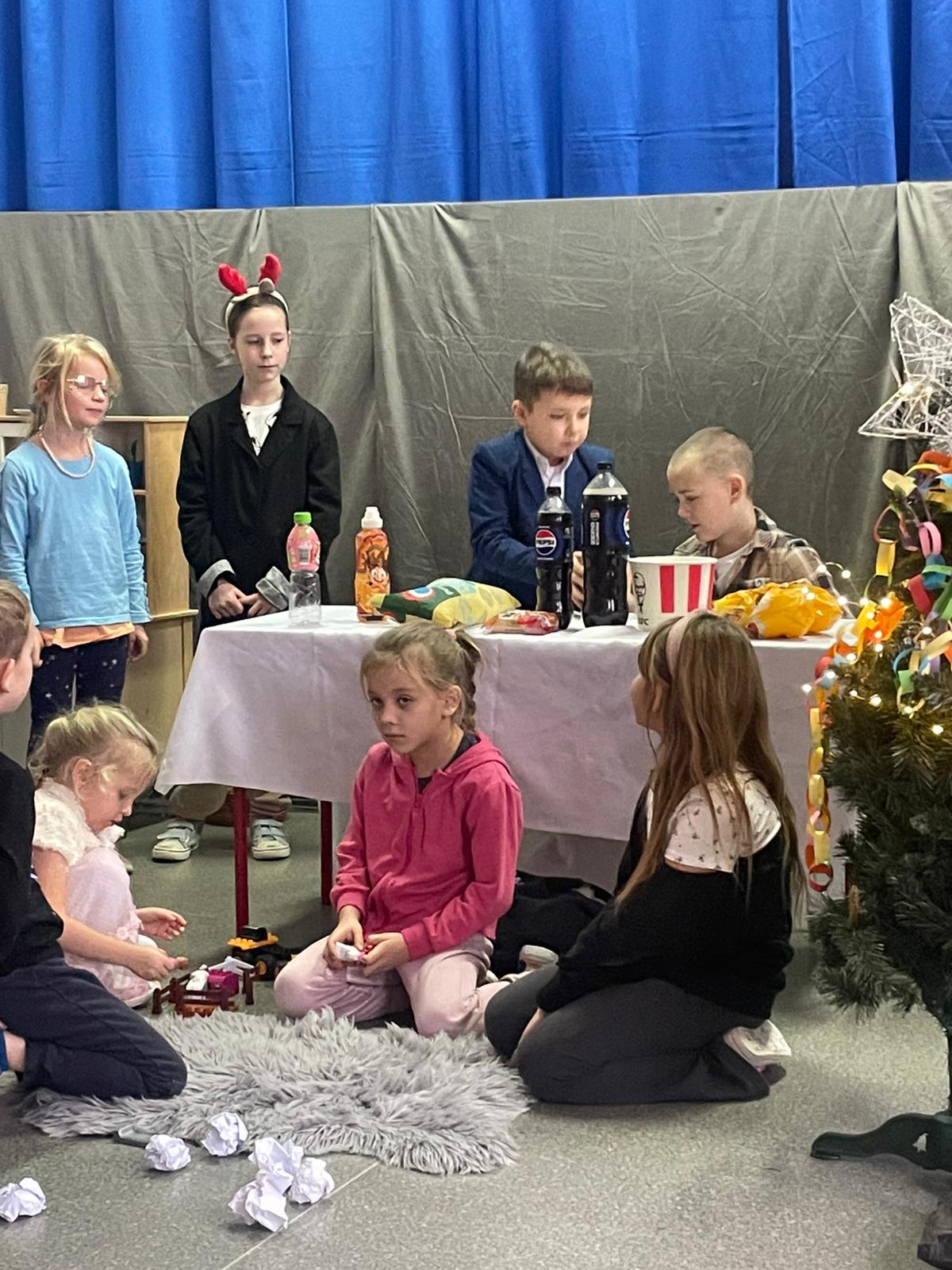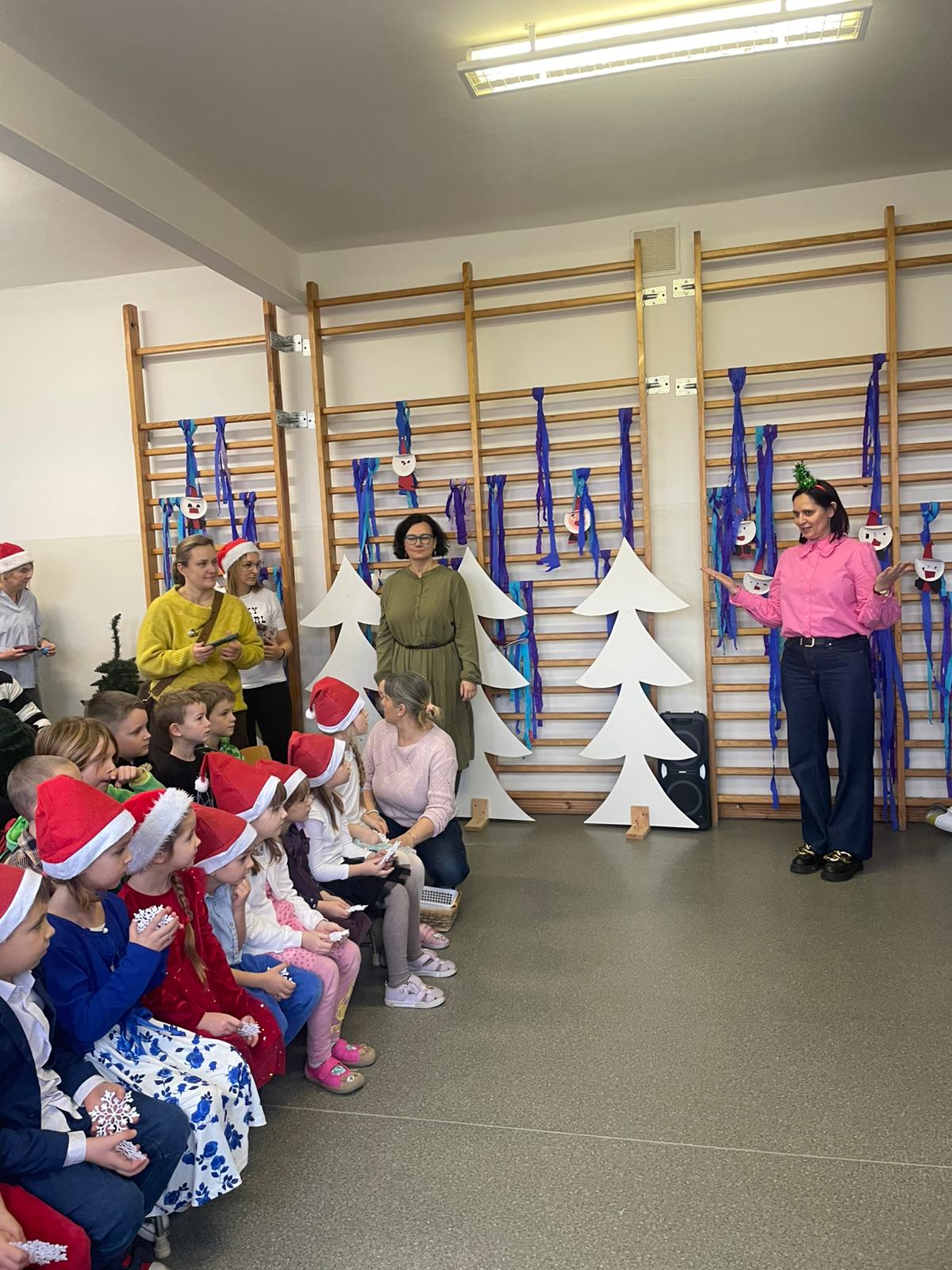 W dniu 12.12.2025 roku w naszej szkole zorganizowaliśmy występy uczniów i przedszkolaków dla gości ze Środowiskowego Domu Samopomocy z Marszewskiej Góry .Dzieci pięknie się zaprezentowały śpiewając piosenki po polsku i angielsku. Wystawiliśmy też spektakl teatralny o przygotowaniach świątecznych, które uparcie próbowało zakłócić czterech "zielonych stworów". Atmosfera była bardzo wzruszająca. Po części artystycznej wypiliśmy wspólnie zimową herbatę i zaśpiewaliśmy kilka kolęd.