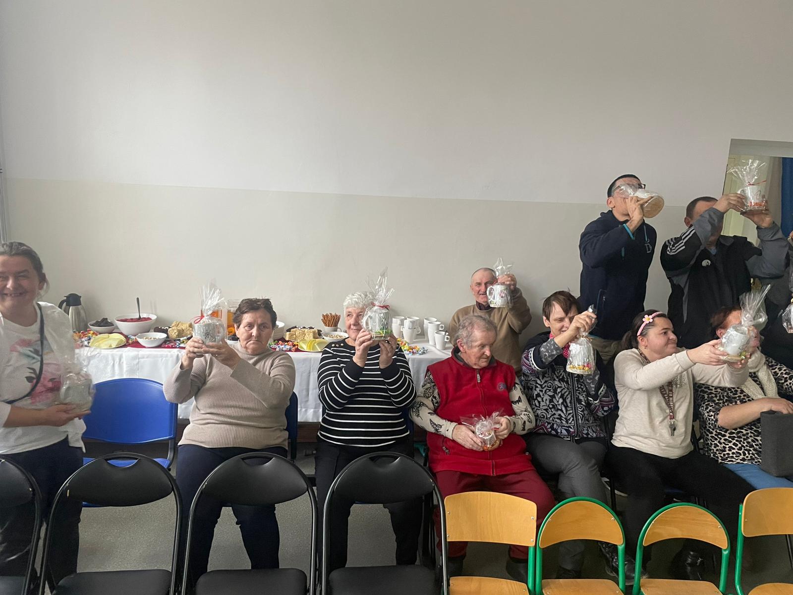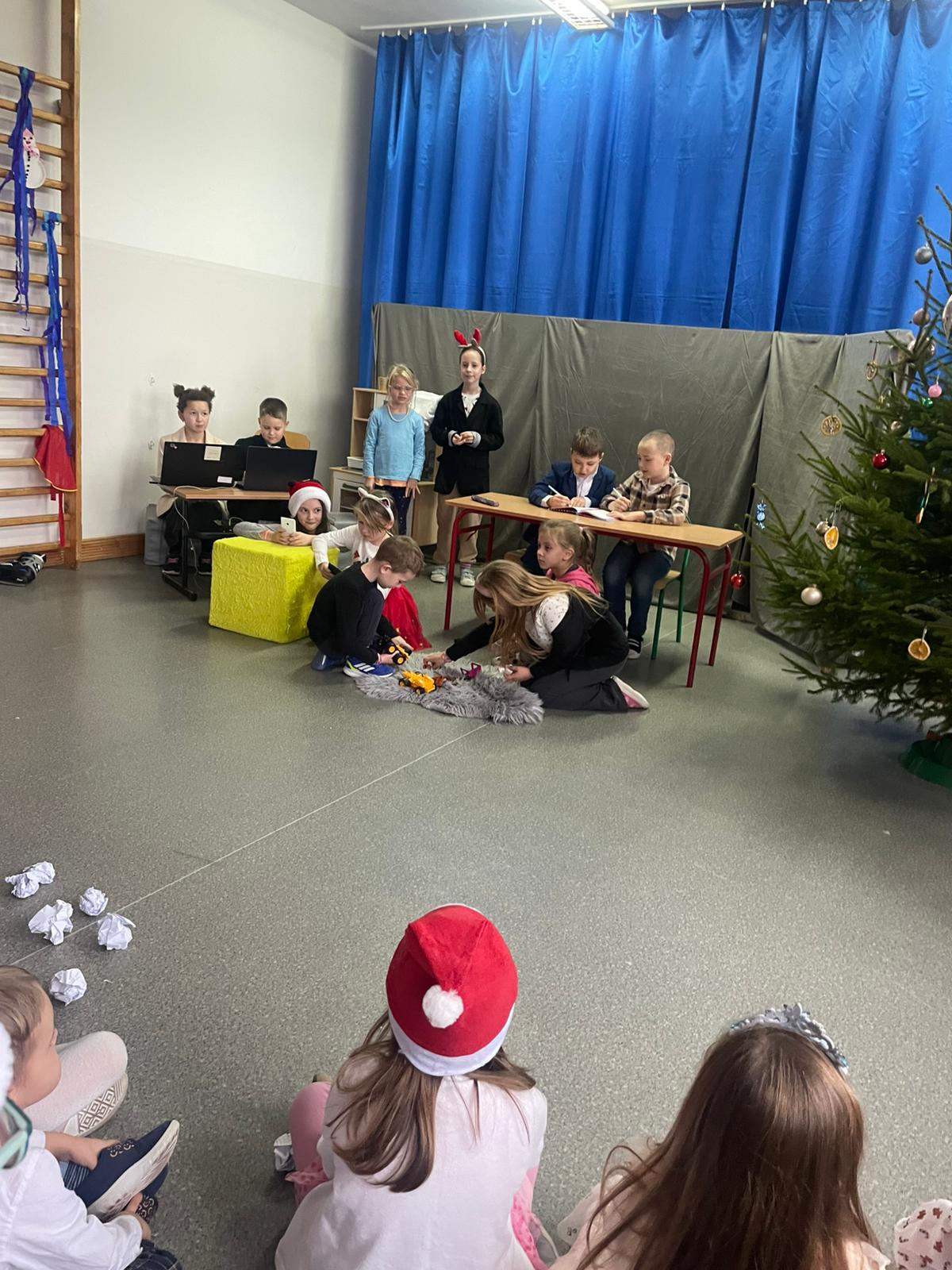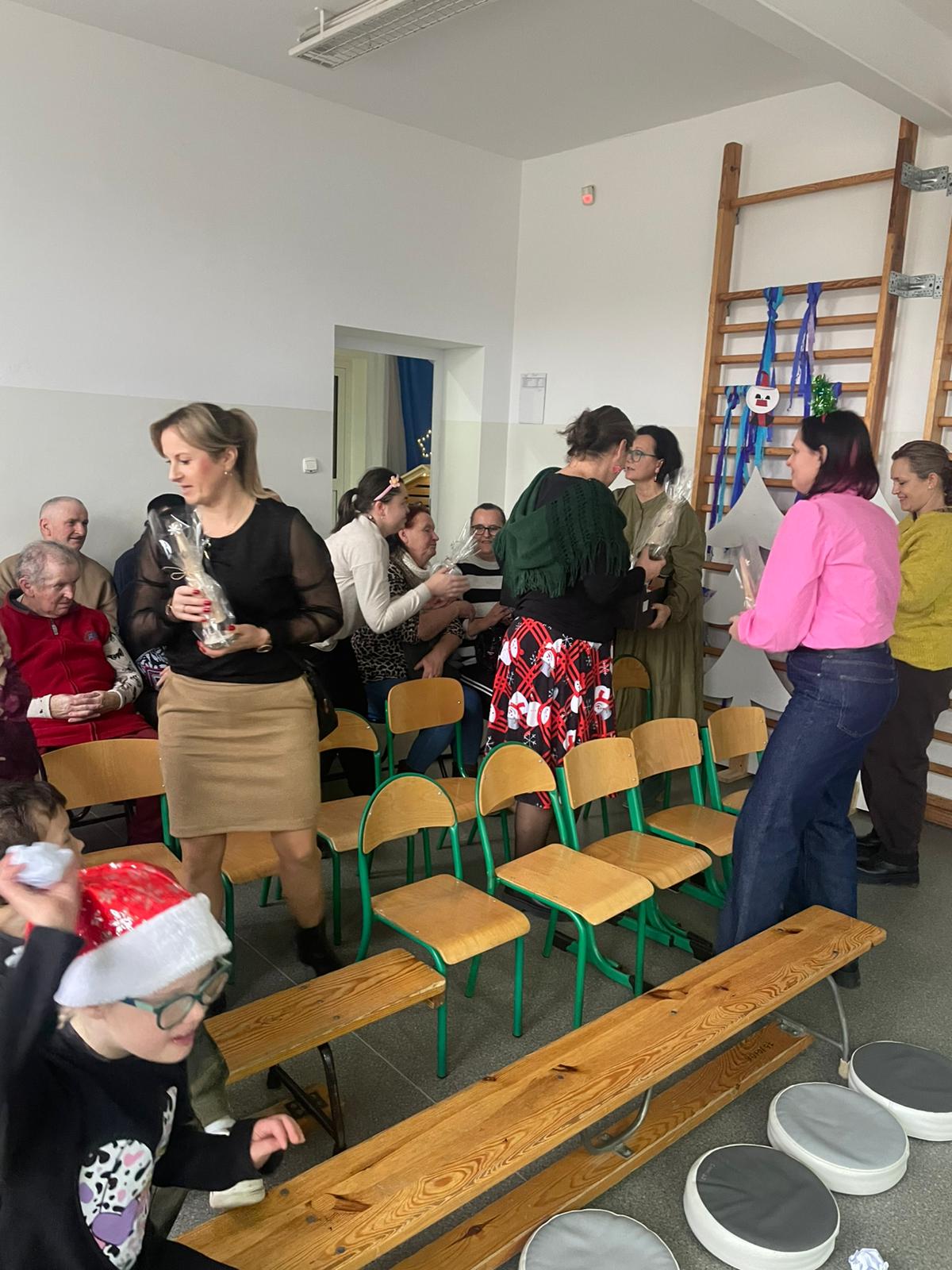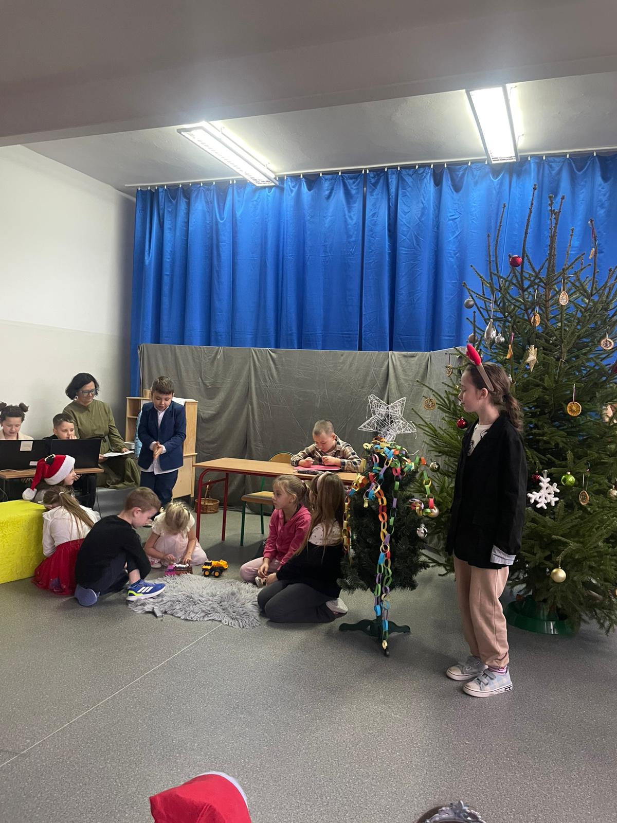 W dniu 12.12.2025 roku w naszej szkole zorganizowaliśmy występy uczniów i przedszkolaków dla gości ze Środowiskowego Domu Samopomocy z Marszewskiej Góry .Dzieci pięknie się zaprezentowały śpiewając piosenki po polsku i angielsku. Wystawiliśmy też spektakl teatralny o przygotowaniach świątecznych, które uparcie próbowało zakłócić czterech "zielonych stworów". Atmosfera była bardzo wzruszająca. Po części artystycznej wypiliśmy wspólnie zimową herbatę i zaśpiewaliśmy kilka kolęd.