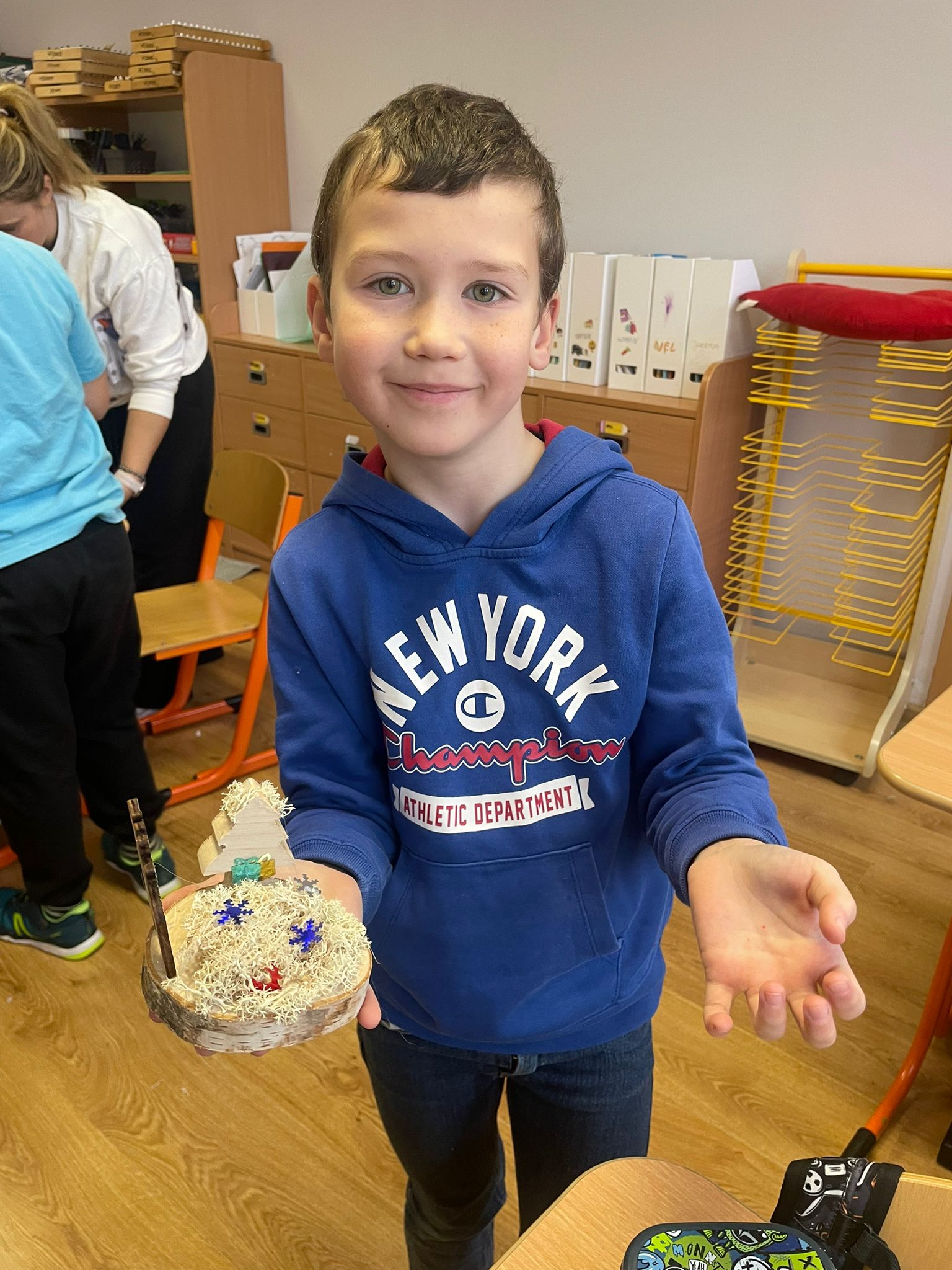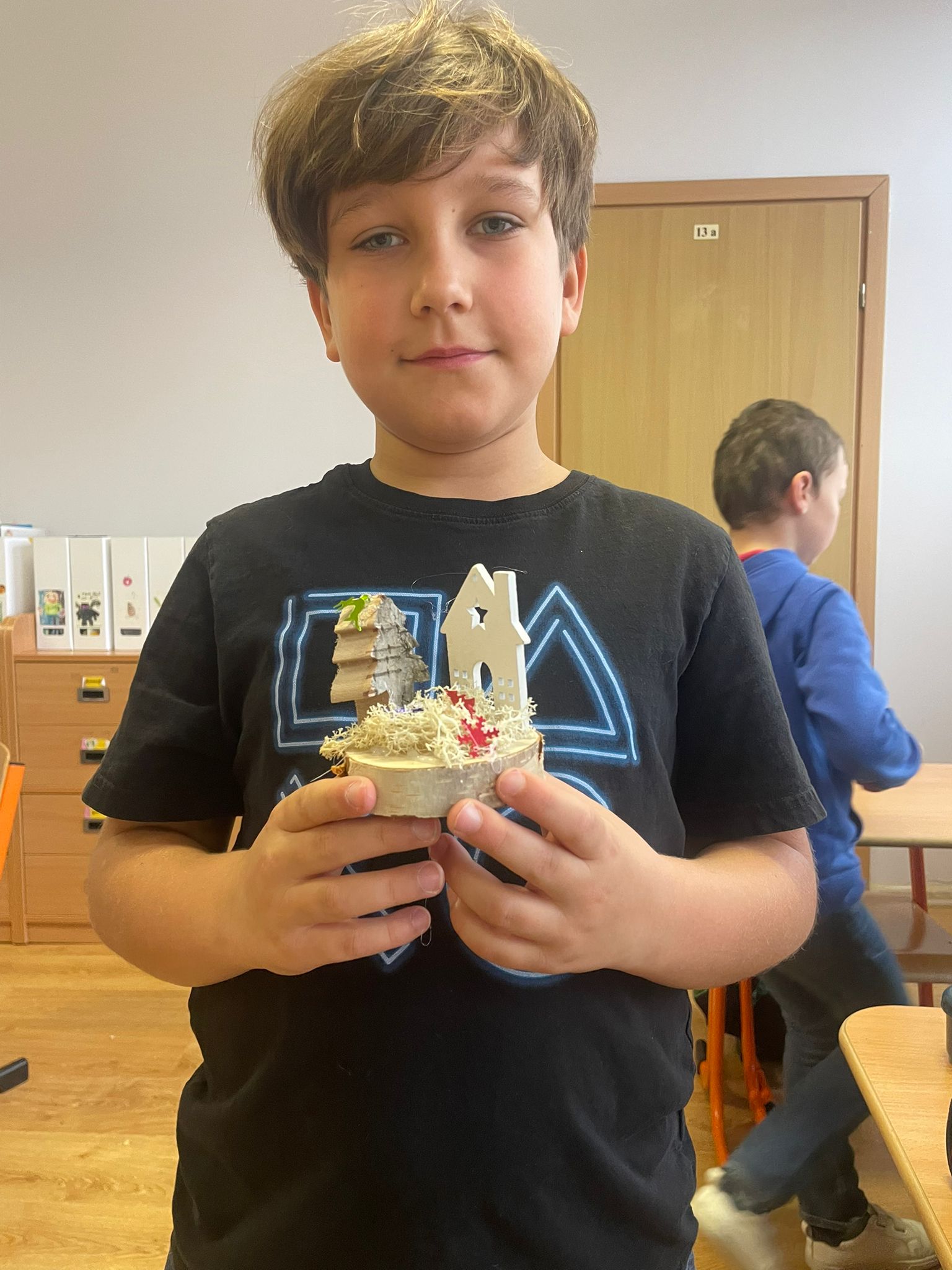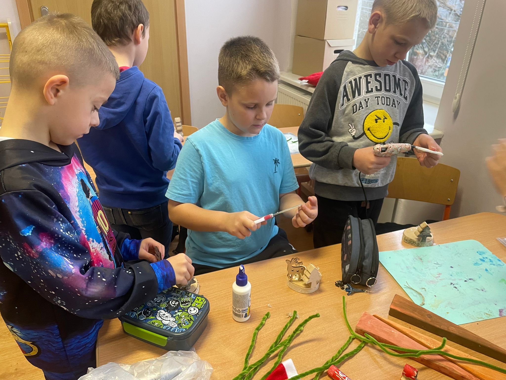 Uczniowie klasy 2 i 3 podczas zajęć z ogromnym zaangażowaniem przygotowywali własnoręcznie ozdoby świąteczne, tworząc wyjątkową atmosferę nadchodzących świąt. Wspólna praca nad ozdobami połączyła uczniów, którzy z entuzjazmem tworzyli dekoracje pełne pomysłowości.