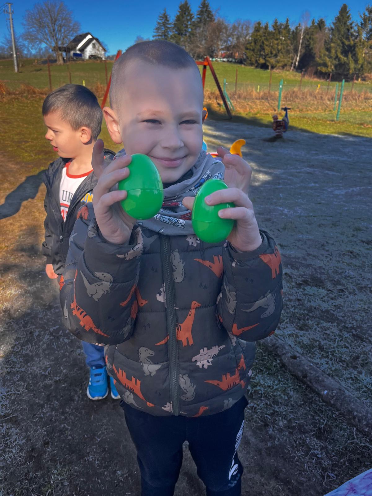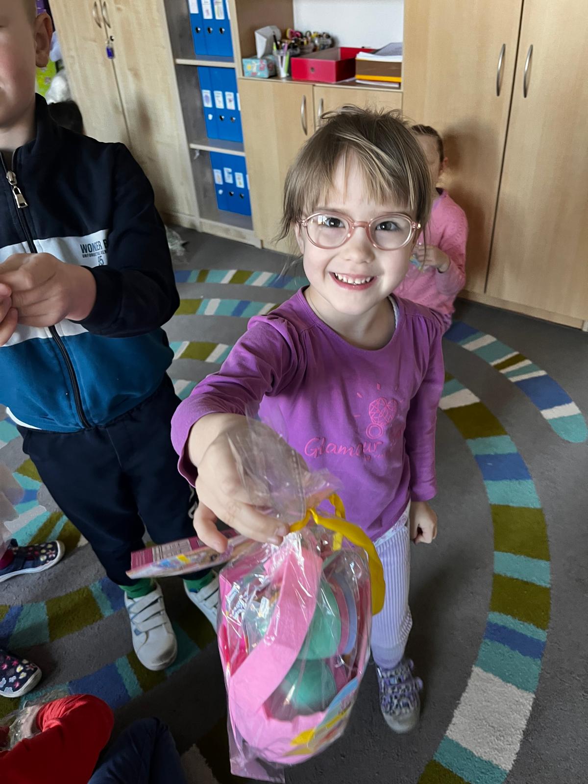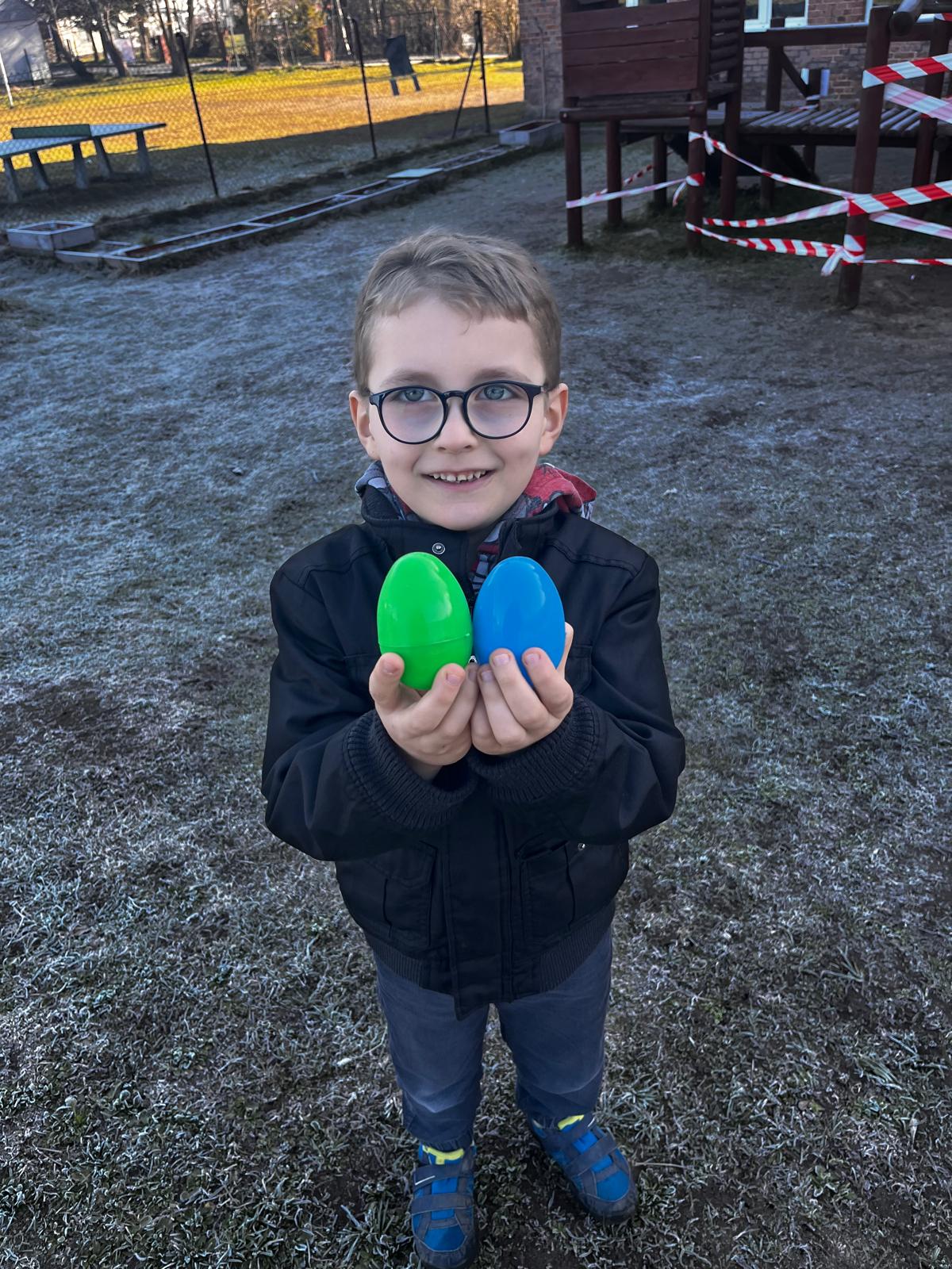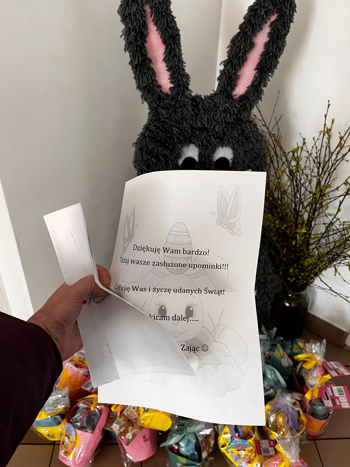 W dniu 01.04.2026r. dzieci z grup Jeżyków i Zajączków otrzymaly list od Zająca z prośbą o pomoc w pozbieraniu kolorowych jajeczek. W podziękowaniu za pomoc Zając Wielkanocny zostawil dla dzieci upragniowe i wyczekiwane upominki.