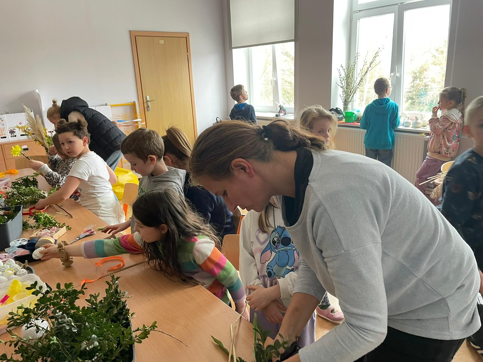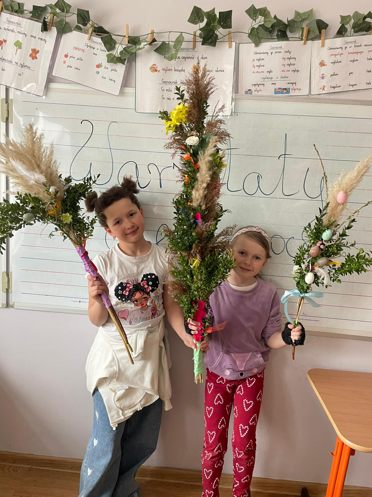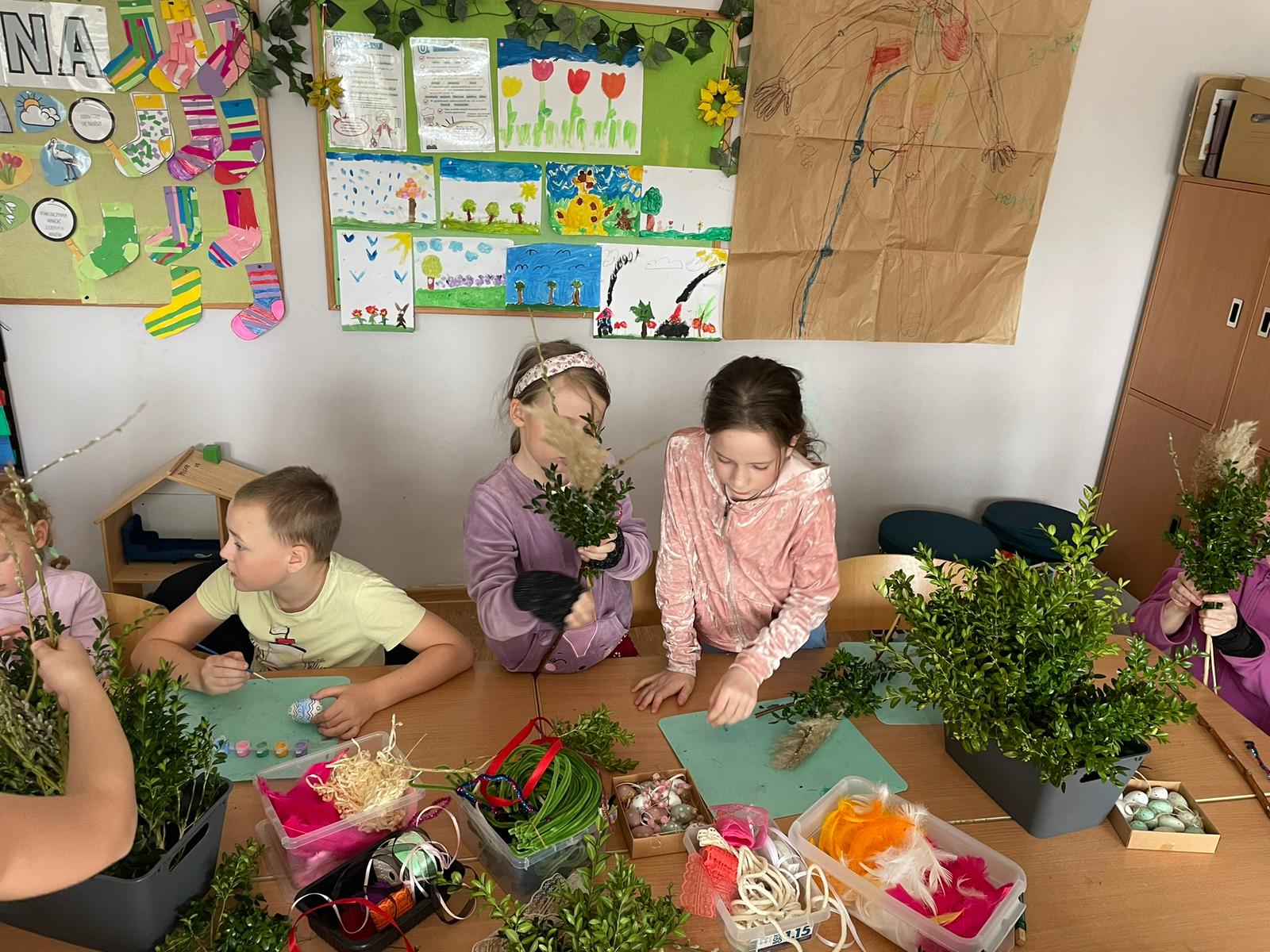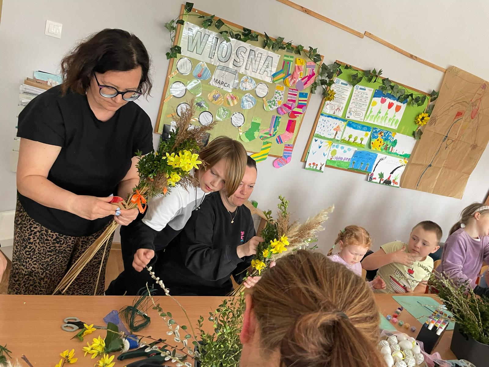 W dniu 26.03.2026r. rodzice i dzieci z klas 1-3 wzięli udzial w twórczych warsztatach wielkanocnych, podczas których wspólnie przygotowywali tradycyjne palmy z bibuly, galązek i kolorowych ozdób. W szkolnej sali panowala ciepla rodzinna atmosfera - pelna śmiechu i wzajemnej pomocy. Każda palma byla inna, wyjątkowa i wykonana z ogromnym zaangażowaniem, a samo spotkanie stalo się piękną okazją do integracji oraz pielęgnowania wielkanocnych tradycji.